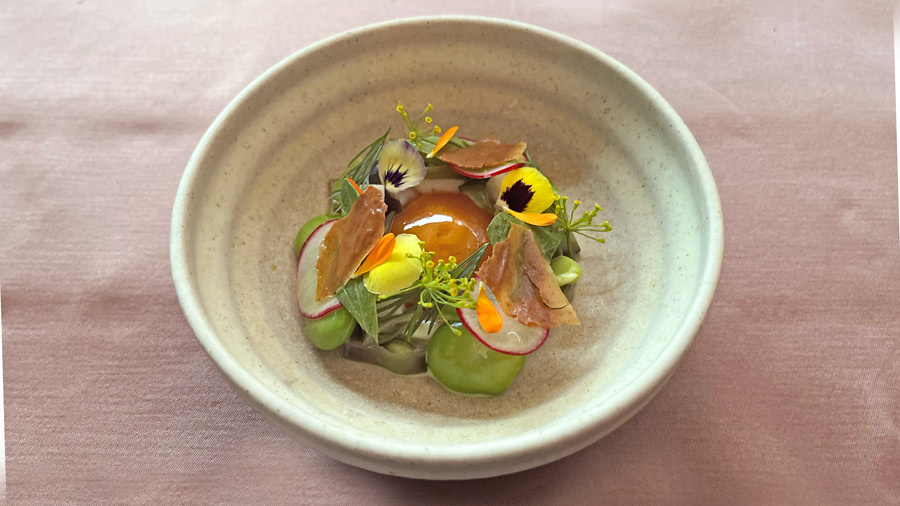 Kad bi Jorg Zupan otvorio specijaliziranu trgovinu samo s ovim proizvodom ne sumnjamo da bi pronašao lojalnu publiku. Idući slijed bio je još bolji; kozice, biljka porijeklom iz Kine, Granny Smith jabuke, zelene jagode i emulzija od medvjeđeg luka. Jelo puno okusa, različitih tekstura. S novim slijedom Jorg Zupan vratio nas je na prvi obrok u danu s puno sezonskih sastojaka, pa nam nije jasno zašto slijed broj dva i slijed broj tri nisu zamjenili raspored kako bi se održao kontinuitet. Žumanjak mariniran u misu i sojinom umaku, bob, grašak, sok od šparoga i pileća kozica umjesto slanine kao hrskavi element u jelu.