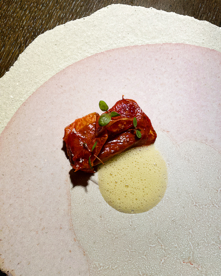 Istarski taco s Latusovim sirom Velim Jože, endivijom i kukuruzom jednostavniji je ali jako ukusan snack. Sasvim lagano pečena (barely touched, da ponovno citiramo Erica Riperta) potrbušina plave tune s “pršutom” od lubenice i pjenicom od pravog, istarskog pršuta, savršeni je primjer ovosezonskog Vellina minimalizma. Točno tri sastojka formirala su jedno od najboljih jela koja smo probali ove godine.