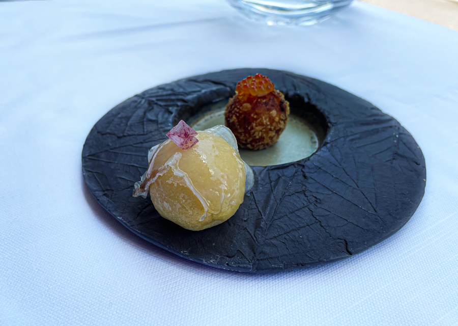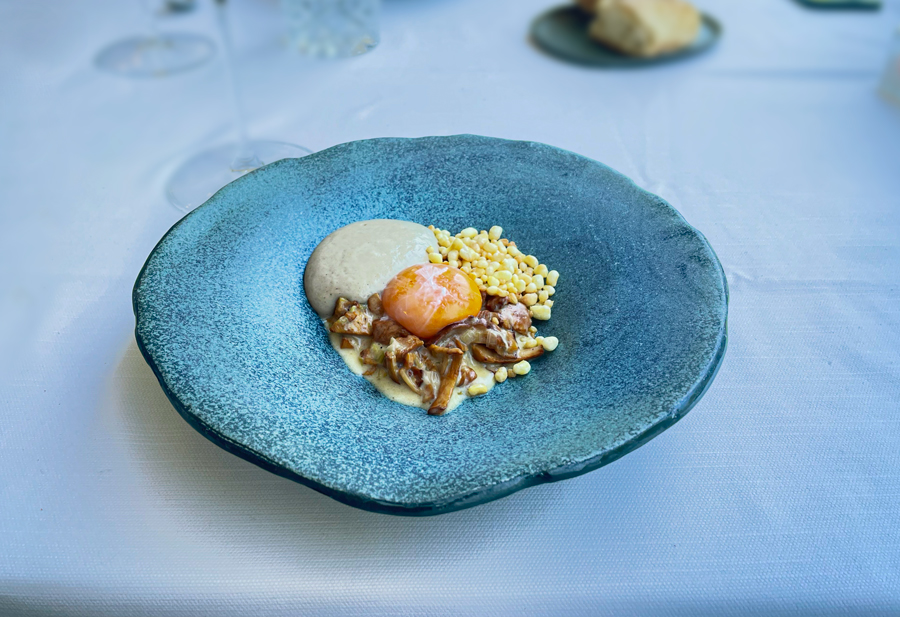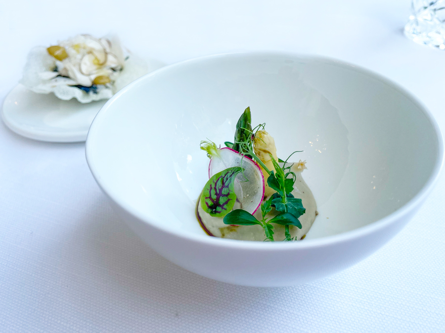 Među snackovima najukusniji je bio blago zadimljeni brioš s lardom, koji se servira u društvu s arancinom s pastrvom i ikrom pastrve. No, ni hrskavac sa sirovim vrganjima na kremi od koprive nije bio loš. Uz vrganje smo dobili i kremu od patlidžana s vršcima zelene i bijele šparoge: svaki se amuse bouche sastoji od dva elementa.