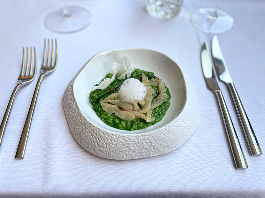 Rižoto s mladim špinatom, šparogama i fileom pastrve tek kratko obrađenim u soli i šećeru, još je jedno briljantno Tomičevo jelo koje pokazuje da dobra pastrva ima potencijal vrhunske delikatese. Rižoto se kuhao s temeljcem od pastrve.