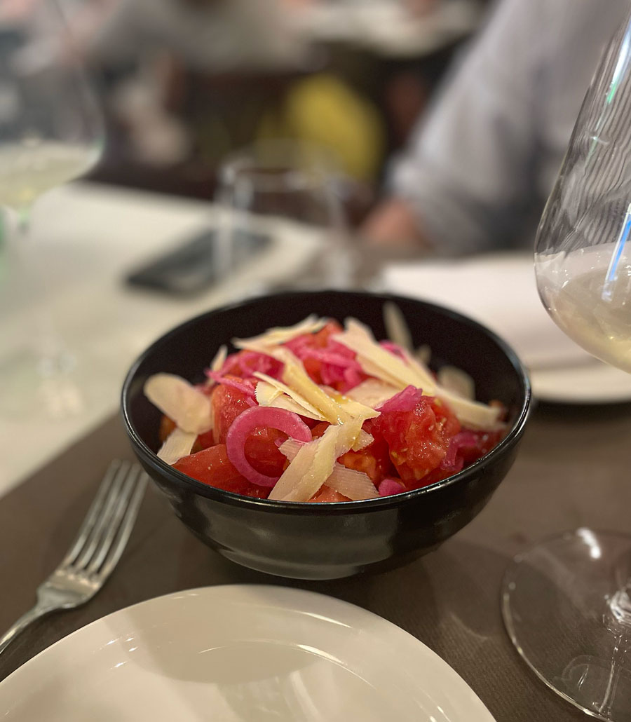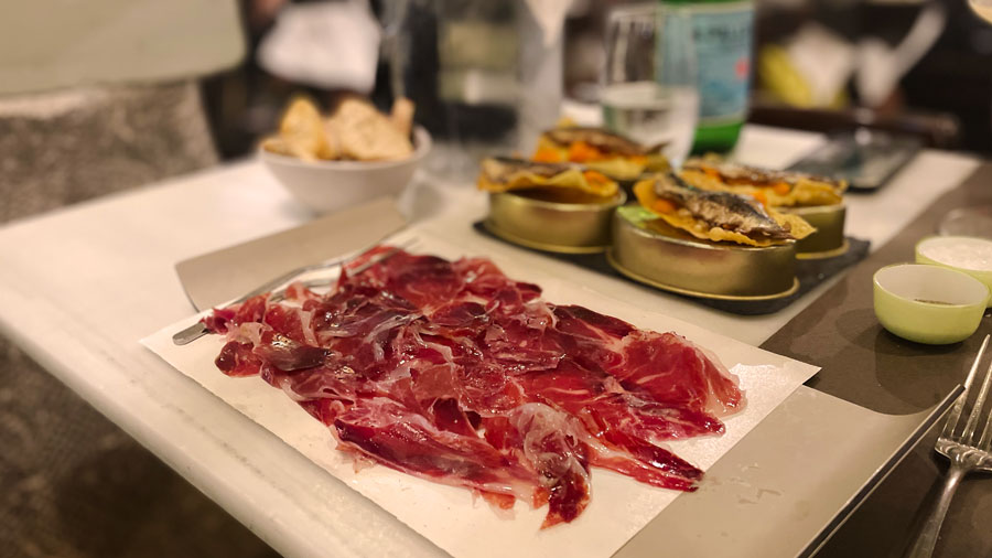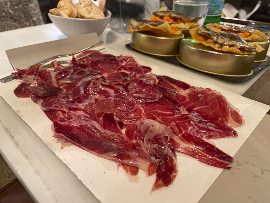 Večeru u Los Fuerosu počeli smo velikom zdjelom salate od ogromnih, sočnih, ružnih rajčica iz Tudele kako zovu ovu lokalnu delikatesu. Rajčice imaju distinktivno kiselkast okus i mirišu po listu rajčice. Slijedio je, naravno, genijalni dvogodišnji pršut, koji se doslovno rastapao u ustima, i kojeg ćemo dugo, dugo pamtiti. U Hrvatskoj ni najskuplja bellota nije tako dobra kao u Španjolskoj, među ostalim i zato što se poslužuje hladna. U španjolskim se restoranima pršut servira na višoj sobnoj temperaturi, pa se fete sjaje od posve neodoljive masnoće najboljih šunki na svijetu.