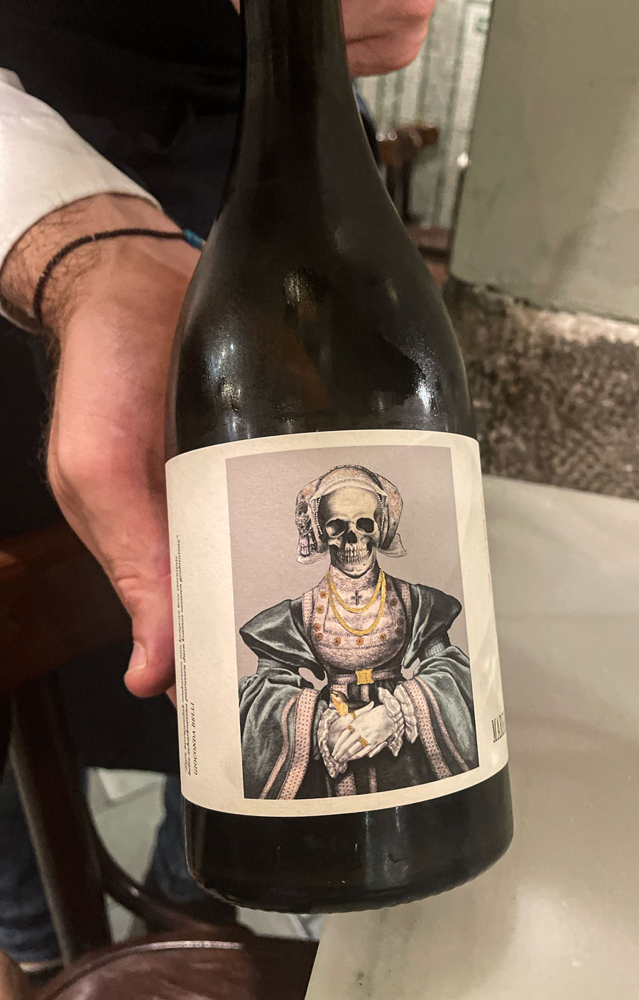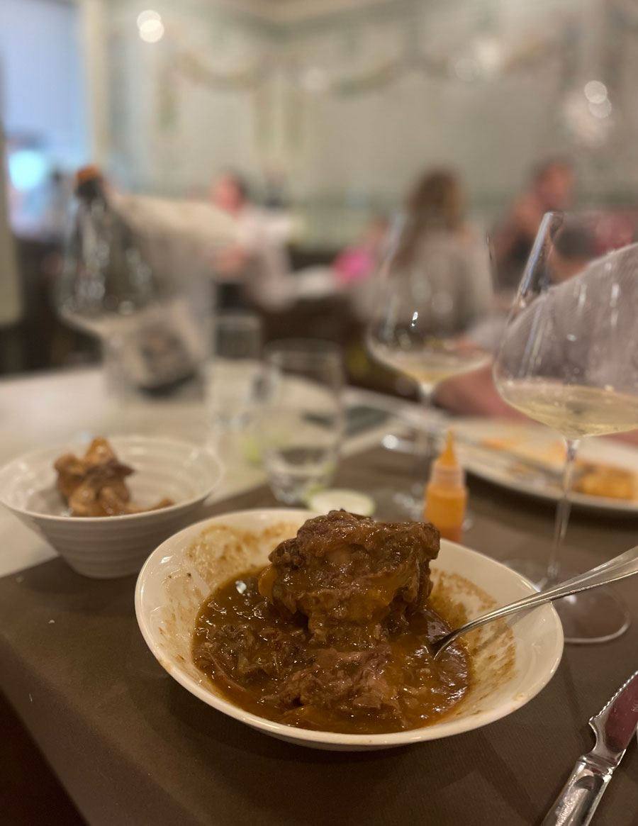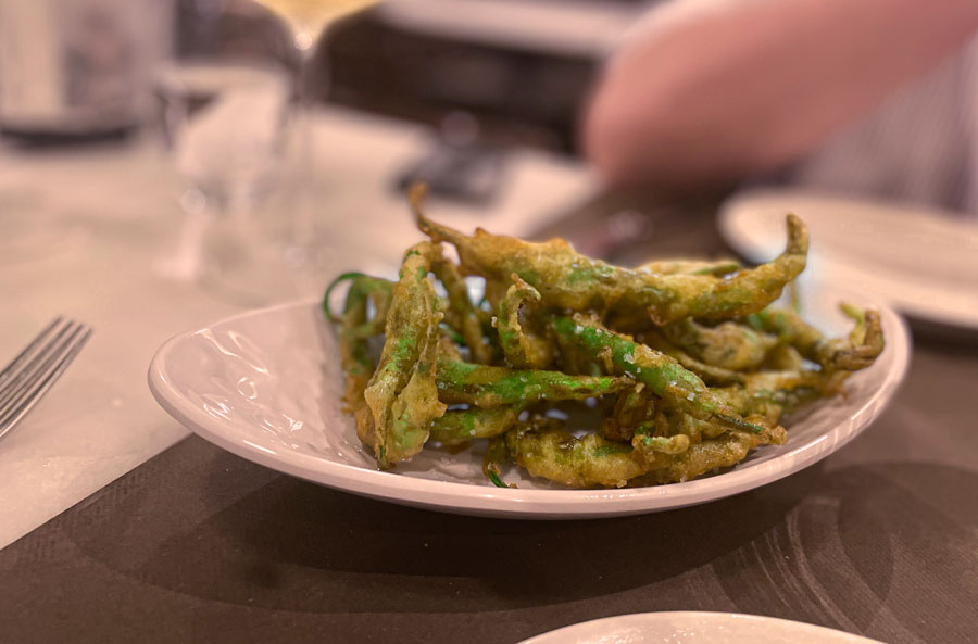 Za glavna smo jela naručili nježno prženi file oslića s crvenom pečenom paprikom i moćni goveđi rep u tamnosmeđem gustom umaku. Meso je otpadalo s kosti, a kosti su bile potpuno bijele, baš kako treba kod sporog kuhanja goveđeg repa. Umjesto desertom, večeru smo završili jako hrskavom tempurom od slatkasto pikantnih zelenih papričica. Uz dvije butelje vina uključujući odlični macerirani txakoli, ovu smo izvrsnu večeru platili 180 eura.