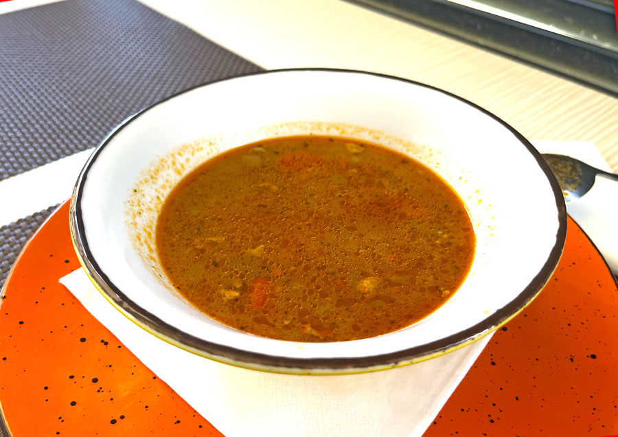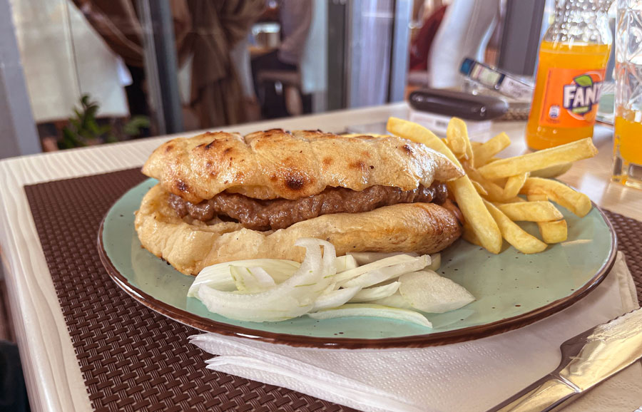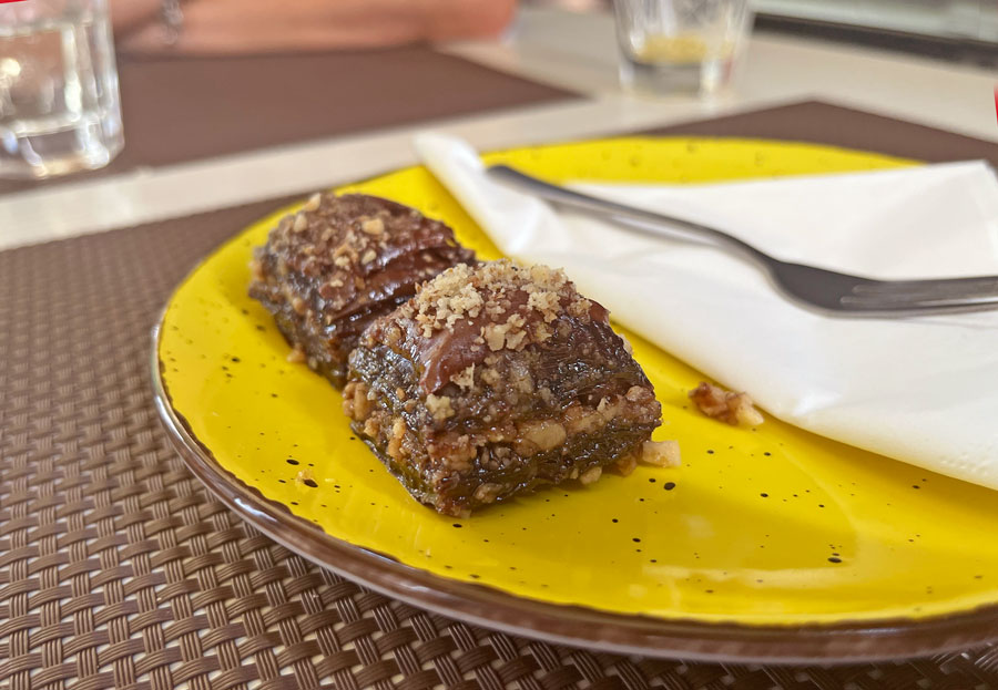 Ručak smo započeli begovom čorbom i trahanom. Bio je to najbolji dio ručka. Ne zato što su ostali tanjuri bili nužno loši, već su juhe, izuzetno ukusne i propisno začinjene, toliko dobre da se samo zbog njih isplati doći u Melek. Za glavno jelo smo naručili ćevape u lepinji i pljeskavicu. Ova dva jela su tek prosječna. Meso je imalo pomalo gumasti okus i nedostajalo mu je sočnosti. Nekako smo se nadali da ćemo dobiti meso koje će podsjećati na neke od najboljih sarajevskih ćevabdžinica. To nažalost nije bio slučaj. Melek se iskupljuje desertima. Baklave koje smo probali su vrlo dobre. U ponudi su im ostale još samo crne s orasima, korektne i prolazne.