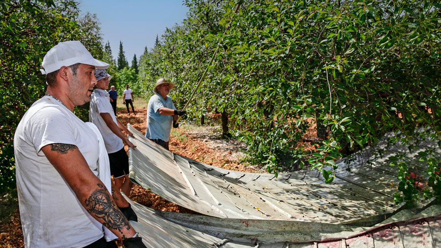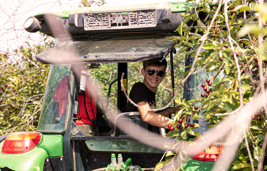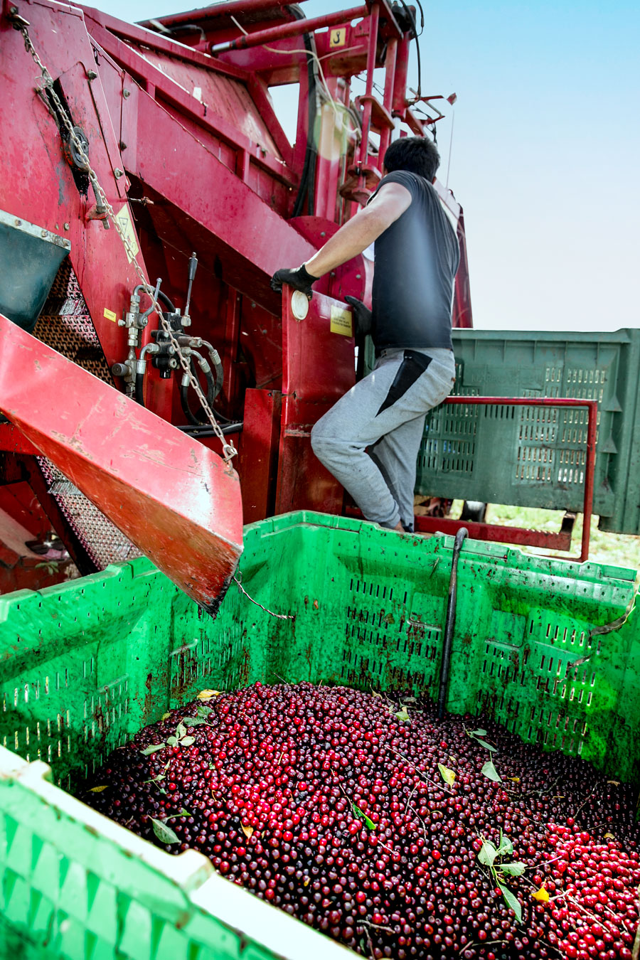 Višnje se ne beru ručno, nego tresačem ili kombajnom. Ali, tresač zahtijeva puno fizičkog rada. Tresač za višnje sličan je stroju koji se koristi i za berbu maslina: on trese drvo, ispod kojeg radnici postavljaju cerade, skupljaju voće, pa ga prebacuju u boksove. I tako od stabla do stabla, po užarenom suncu, cijeli dan.