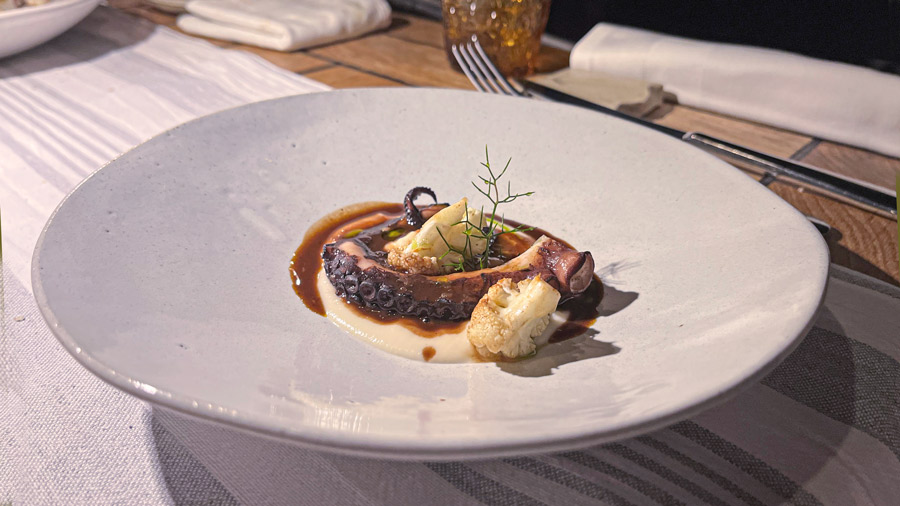 Četvrti slijed i prvo toplo predjelo bio je definitivno najbolji tanjur večeri. Škombar, odnosno skuša, krema od kukuruza spojena s tehnički savršenim hollandaise umakom, mahune koje teksturom neodoljivo podsjećaju na popularni mac and cheese, crumble od inućuna, umak od pečene paprike i vlasac. Ovdje Stiven pokazuje elegantnu ruku, bez puno pretjerivanja u tehnikama. No, svaki element ima svoje mjesto na tanjuru s različitim teksturama, a okusi su maksimalno izvučeni i međusobno se nadopunjuju.