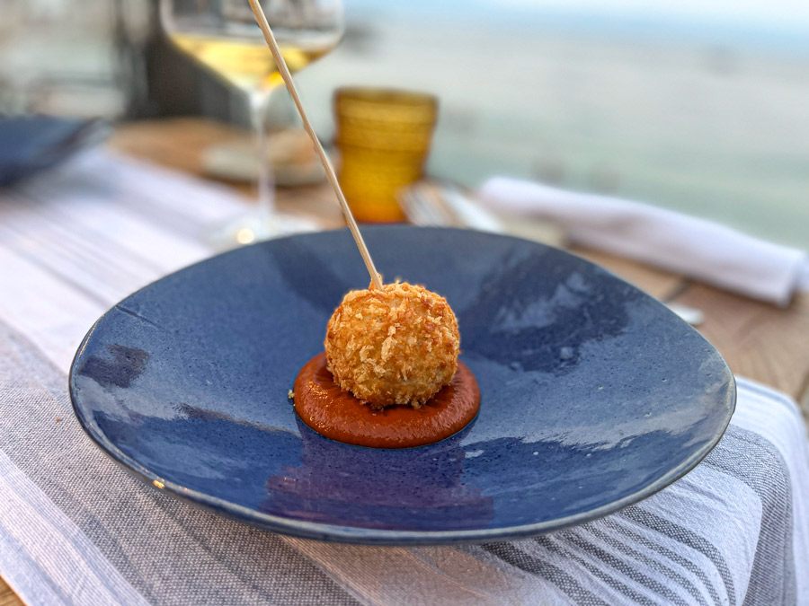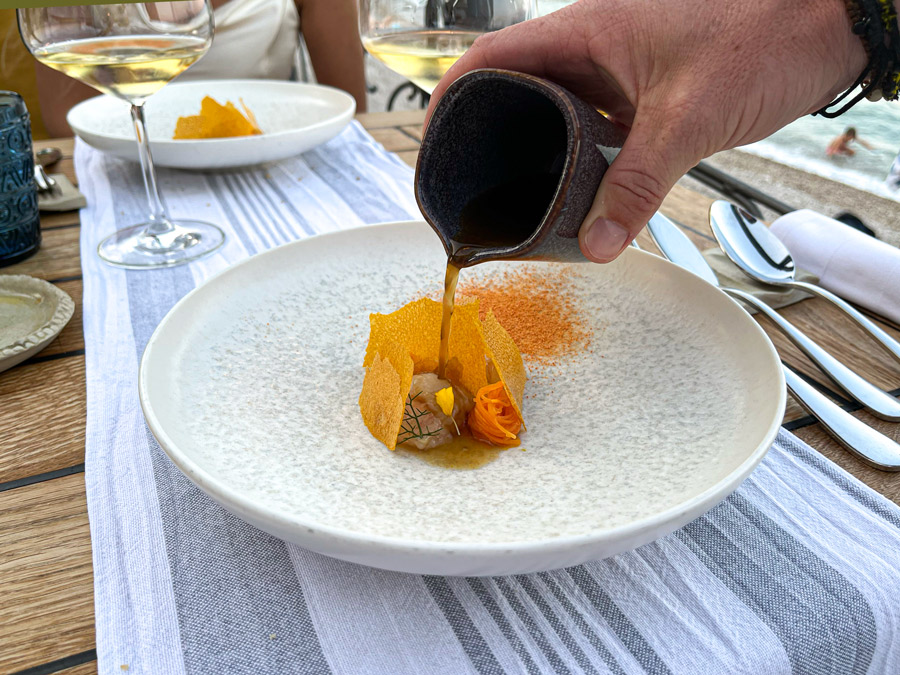 Naručili smo degustacijski menu koji se sastoji od sedam ili osam jela plus pozdrav iz kuhinje. Večera je započela laganim i dobro odmjerenim pozdravom, slanom fritulicom punjenom inćunima i domaćim kruhom od kiselog tijesta, jednim od boljih na Kvarneru. Prvi slijed odaje počast vrlo vjerojatno najboljoj deliciji s ovog područja, kvarnerskom škampu. Mesnati sirovi škampi tretirani su lagano, s tek pokojom kapljicom limuna, a dodatnu vrijednost daje im juha od algi s đumbirom i glavom škampa. Škampi su zasluga Stivenova oca, škampara, a juha chefova. Stiven Vunić ovoj je jelu dodao zanimljiv twist s okusima Azije. Škampe i juhu je pratio čips od mrkve, ukusni hrskavi element na tanjuru.