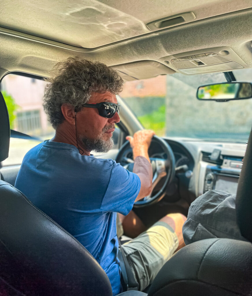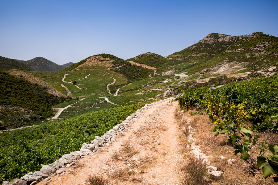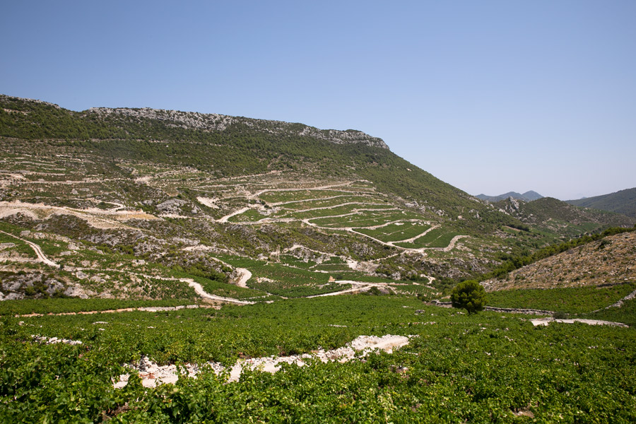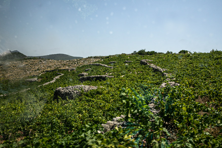 Poslije obilaska nove vinarije i prolaska kroz mali stari podrum, isti onaj gdje smo prije točno 25 godina upoznali Franu Miloša, gospodin Miloš odvezao nas je u svoje vinograde iznad Ponikava i Prapratnog. Radi se o nekoliko desetaka hektara velikoj terasastoj parceli, do koje se dolazi opreznom off road vožnjom po strmim zavojima punima sitnog i nešto krupnijeg kamenja. Miloševi terasasti, strmi, stjenoviti i zapravo surovi vinogradi najljepši su i najdramatičniji vinogradi koje smo vidjeli u Hrvatskoj.