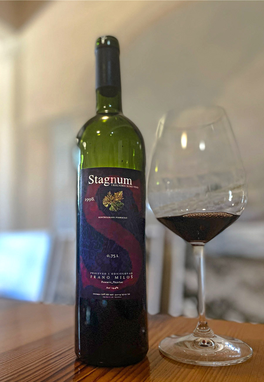Stagnum iz 1998. mladenački je vibrantan, ne treba mu dekantiranje, bouquet ne sadrži nimalo prašine tipične za starija vina, nego je i dalje prepun tamnog voća i makije, i intenzivan poput velikih berbi Lafitea i Latoura. Na okusu je slastan, sočan, linearan i beskrajno dug. Riječ je o jedinom hrvatskom suhom vinu koje može vrijediti čistih 100 bodova, pod uvjetom da su i druge boce u podjednako perfektnom stanju kao ova koju smo probali u utorak 26. srpnja oko tri popodne. Na kraju smo još kušali jedan poluslatki i jedan slatki Stagnum. Slatki, iz 2016. godine, s oko 80 grama neprevrelog šećera, prilično je impresivan.