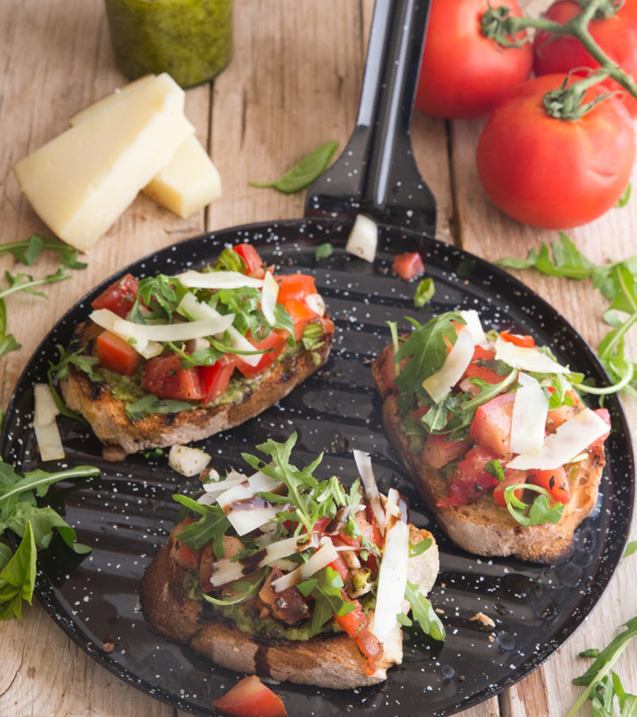 Prepecite fete kruha, premažite ih tankim slojem pesta, na njih složite malo svježe rajčice, malo rikule, dodajte parmezan ili mozzarellu. Može li jednostavnije?