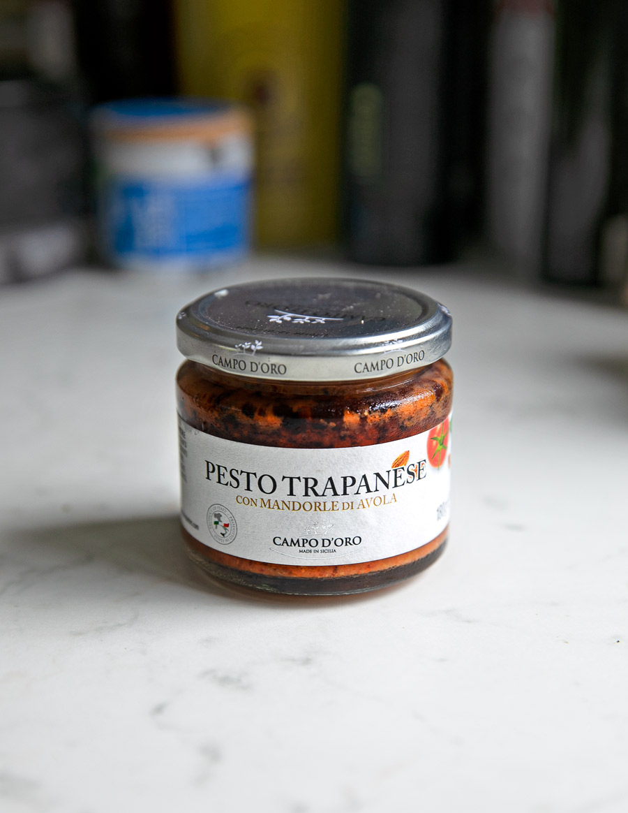 Ovaj tradicionalni sicilijanski pesto od rajčica nazvan po provinciji Trapani, specifičan je jer sadrži rajčice sušene na suncu i puno badema iz Avole. Ta kombinacija stvara bombu okusa. Sadrži i češnjak, koji daje dodatni akcent jelima u kojima ga možete koristiti. Ponovno, svi su sastojci izvrsno balansirani, ništa od okusa ne iskače, dominira genijalni okus sušenih rajčica, a ljute papričice prisutne su samo da bi sve okuse držale na visini, pesto nije ljut. Ovo je nešto robustniji pesto, idealan za meso. U tjesteninama ga koristite s dosta tek naribanog parmezana ili pecorina.