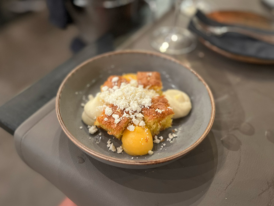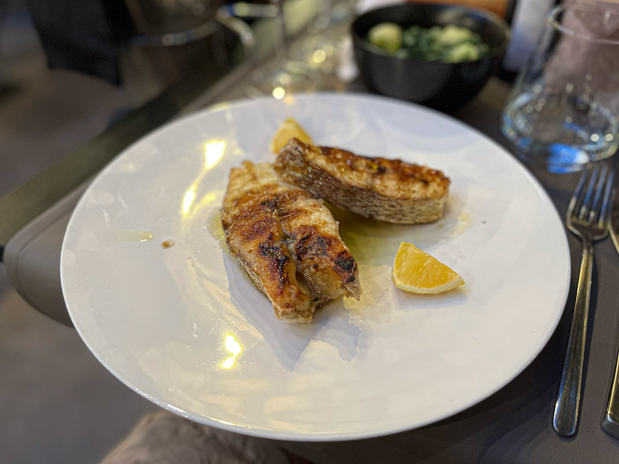Glavno riblje jelo na meniju bio je pagar. Pagar je doslovno briljirao, perfektno pečen istodobno čvrste teksture i mekanog mesa. Kožica je profesionalno napravljena, odnosno hrskava i puna dubokih okusa. Uz pagara je došao i špinat s krumpirom. Špinat je također dosljedno pratio pagara te nemamo nikakvih zamjerki na njega, kako to obično bude u restoranima. Desert se također mijenja na dnevnoj bazi, simpatično se u jelovniku zove “Pitaj konobara”. Deserti, rak rana gotovo svih naših restorana ovdje su bili i više nego dobri. Kreativni biskvit od maslinovog ulja i naranče je odličan, a truffles od belgijske čokolade i kakaa se doimaju luksuzno.