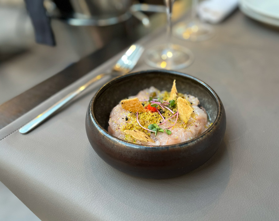 Naša večera je započela tartarom od kozica koji je uzorno napravljen. Tartar pomiješan s pistacijom i blago tretiran s par kapljica limuna i maslinovog ulja, imao je vrlo ugodnu konzistenciju i lijepu teksturu. Okusom također ne zaostaje i sasvim je dovoljan kao predjelo za dvoje. Krekeri koji idu na tartar su bili toliko vlažni da se ne mogu nazvati krekerima. Uz to bilo ih je premalo. Na svu sreću Šug ima izvrstan domaći kruh koji nadomješta sve nedostatke krekera.