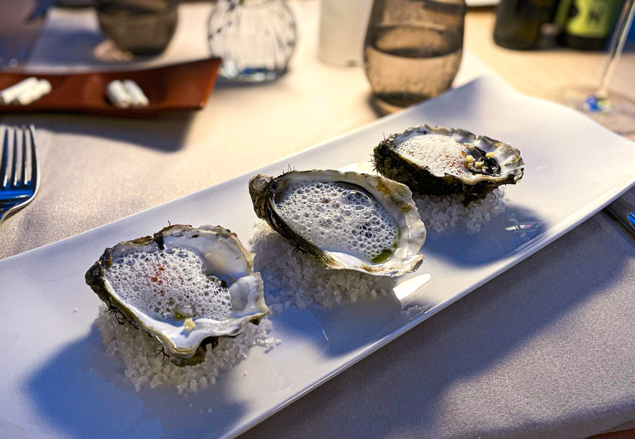 No, u četvrtak navečer Miramare nije živio samo od fenomenalnog ugođaja. Hrana je bila otprilike tristo posto bolja nego tijekom našeg zadnjeg posjeta. Jelovnik je, doduše, i dalje pomalo generičan. Ali, kuhanje je vrlo dobro do izvrsno. Kamenice s kefirom i vlascem bile su gotovo jednako senzacionalne kao grmljavinski light show. Sashimi, tataki i tartar od plave tune imali su čiste, prepoznatljive okuse plemenite masne ribe, baš kao i perfektno pečeni blijedoružičasti tunin odrezak .
