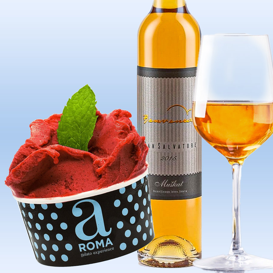 Gelato od jagode proizvodi se isključivo od jagoda, bez bilo kakvih praškova, dodataka i pojačivača okusa ili boja. On,dakle, pršti prirodnim okusima jagoda, koji nisu preslatki. Uz ovu elegantnu voćnu bombu uokvirenu zelenom svježinom mente dobro je probati slatko vino. Dakle ne polusuho, ne poluslatko nego baš ultrabogato slatko vino, poput platinastog muškata San Salvatore braće Benvenuti. U ovom će slučaju gelato osvježiti moćno vino iz Motovuna.