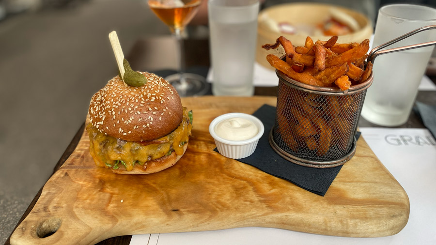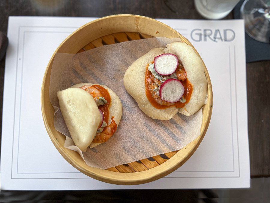 Za glavno jelo smo naručili Gradski burger i dvije vrste bao bunsa. Burger je također uzoran i opet je jedan od najboljih burgera u centru Rijeke. Odlično pecivo, sočno meso i dobri umaci. Uz burger ide i batat pommes koji je vrlo dobar. Na bao bunse su posebno ponosni u Gradu, jer su ih među prvima predstavili Riječanima. Jedni su punjeni kozicama, a drugi carskim mesom. Uz mesnate i dobre kozice ide sriracha umak, dok su bao bunsi s carskim mesom lagani i funkcioniraju odlično kao snack.