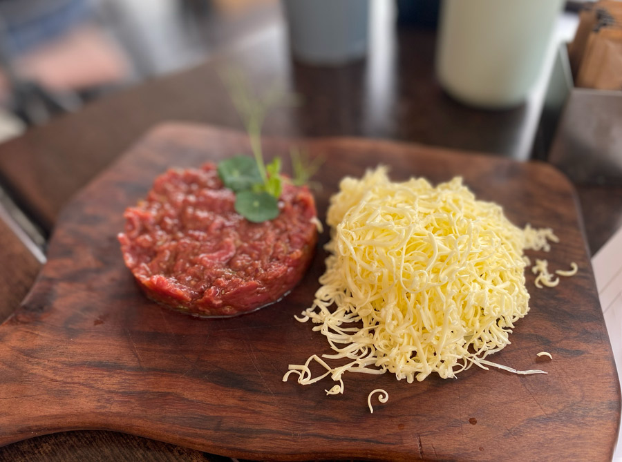 U ponudi za ručak Grad ima nekoliko manjih zanimljivih street food jela. Tu su burger, bao bunsi, razni noodlesi, falafel, salate i nekoliko tartara. Jelovnik je dakle malen i nepretenciozan, dovoljan za brzi ručak ili večeru. Za ručak smo naručili po nekoliko manjih jela. Htjeli smo početi s tartar biftekom, ali konobarica je donijela sva jela u isto vrijeme, iako smo naglasili da bi počeli s tartarom. No dobro, greška u koracima. Gradski tartar uistinu je izvrstan tako da smo oprostili ovu pogrešku. Tartar nije pretvoren u paštetu i teksturom je školski primjer tartar bifteka, a ni okusom nije zaostajao. Definitivno jedan od najboljih tartara u centru Rijeke. Jedino što je falilo uz njega je mrvicu bolji kruh od običnog tost kruha iz supermarketa.