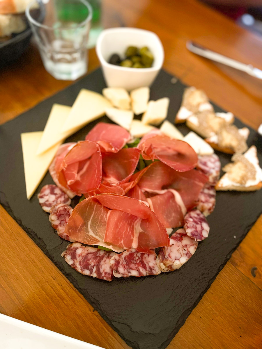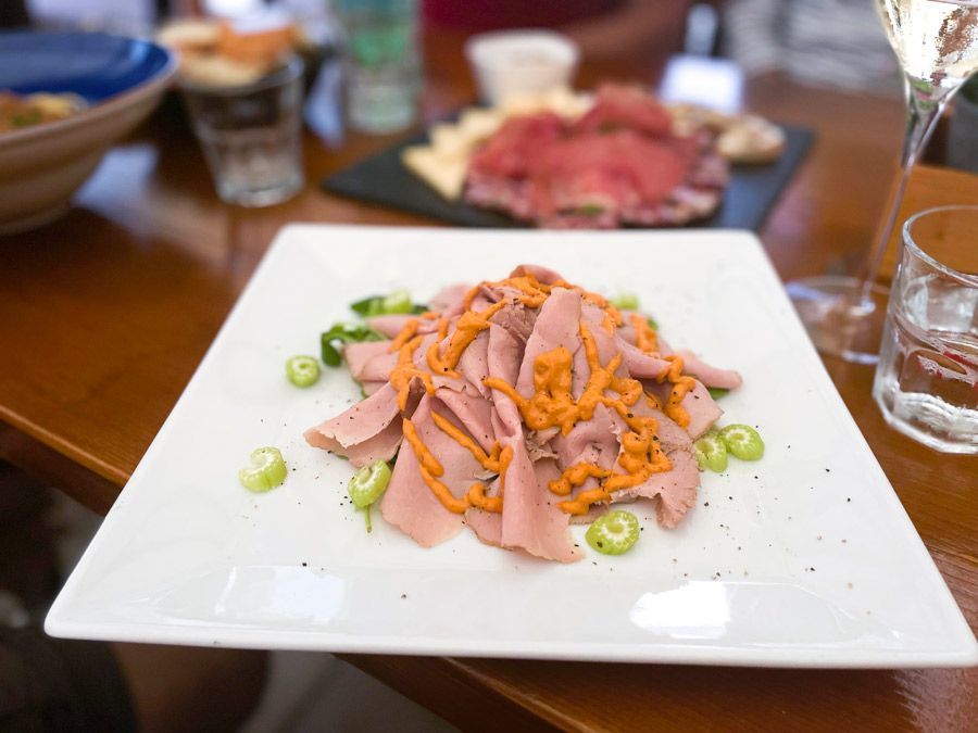Za predjela smo naručili Pijat Fakin, izbor pršuta, salama i sireva, i vitello tonnato. Pršut je bio vrlo dobar, s jasnim okusom mesa, nije bio preslan ni presušen, a istarske sušene kobasice bile su još bolje. Zreli ovčji sir bio je senzacija. Nažalost, kruh u konobi Fakin je najslabija točka i kvari dojam prilično dobre hrane. Teletina u vitellu tonnatu bila je uzorna, ali umak kao da je došao iz nekog fast fooda. Umjesto laganog umaka od tune, dobili smo par crta neke narančaste kreme koja je podsjećala na majonezu sa srirachom i gomilu matovilca. Od tog nas je umaka okus sirovog češnjaka proganjao još 24 sata.
