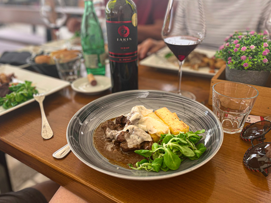 Glavna jela su popravila dojam. Većina jela na meniju, možda i prevelik broj, sadrže tartufe. No apsolutno nijedno se ne radi ni s tartufatama ni groznim uljima od lažnih tartufa, iako fakin, nepotrebno, na stolu uz svoje vrlo dobro maslinovo ulje drži i ulje s tartufima. Sve što naručite s tartufima dolazi s pravim svježim crnim tartufima, u raznim količinama, ovisno o jelu. Za glavna jela naručili smo janjeće kotlete u umaku od timijana, svinjski file u umaku od tartufa i ragu od divljači s palentom.