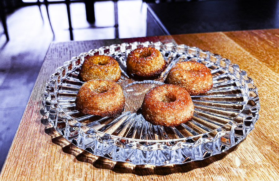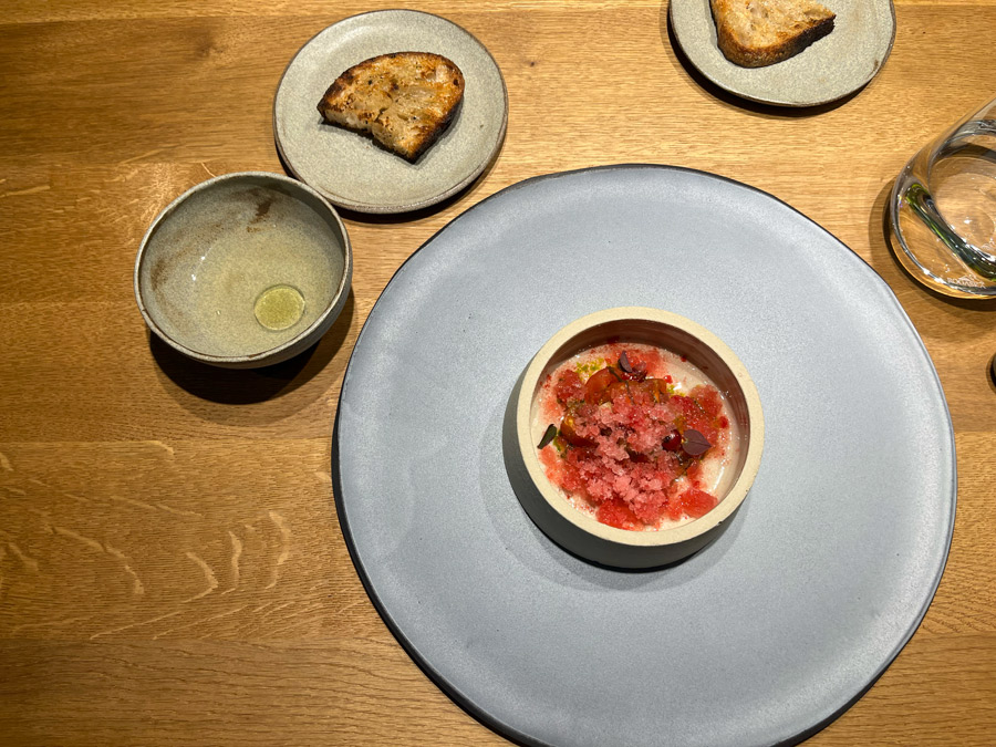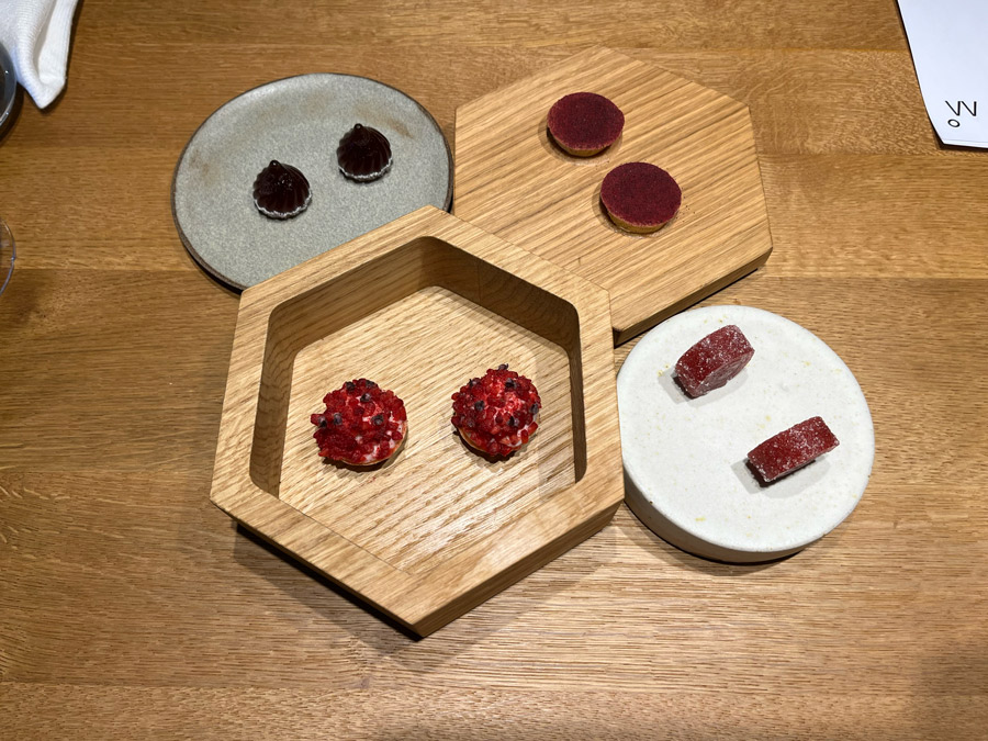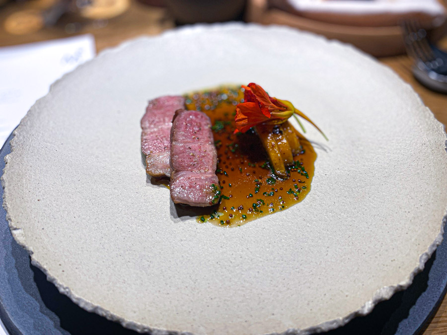 Mislili smo kako će dojam popraviti hrana. Nažalost, to se nije dogodilo. Hrana je prije svega lijepo prezentirana. Najbolje i najuzbudljivije stvari događaju se izvan službenog jelovnika, dakle u pozdravima i petit foursima. Pozdravi iz kuhinje su kreativni i ukusni. Linzer keksi punjeni pilećom jetricom su ugodno iznenađenje slatkasto-slanih okusa. Ostali pozdravi, poput hrskavih kolačića punjenih tikvicama, također ne zaostaju. Apsolutno najbolji tanjur dogodio se u sredini ručka, kao određeni intermezzo. Pržena svinjetina, celer, poriluk i dagnje stvorile su kreativnu bombu okusa. Prvi pravi slijed, sastavljen od rajčica i granita, prilično je zaboravljiv i nije imao esenciju okusa rajčica. Najbolji slijed na četverosljednom jelovniku sastoji se od kupusa i tolminskog sira. Tolminski sir zaista je ukusan.