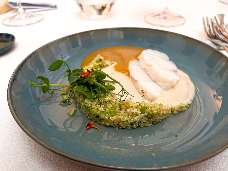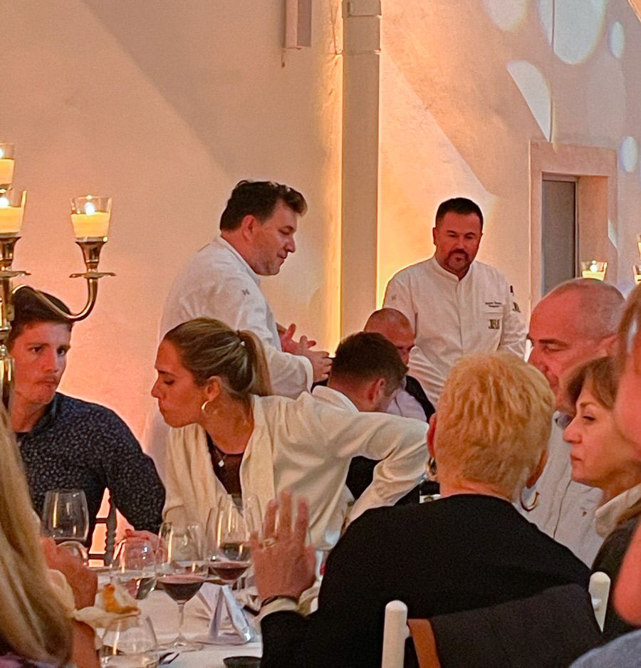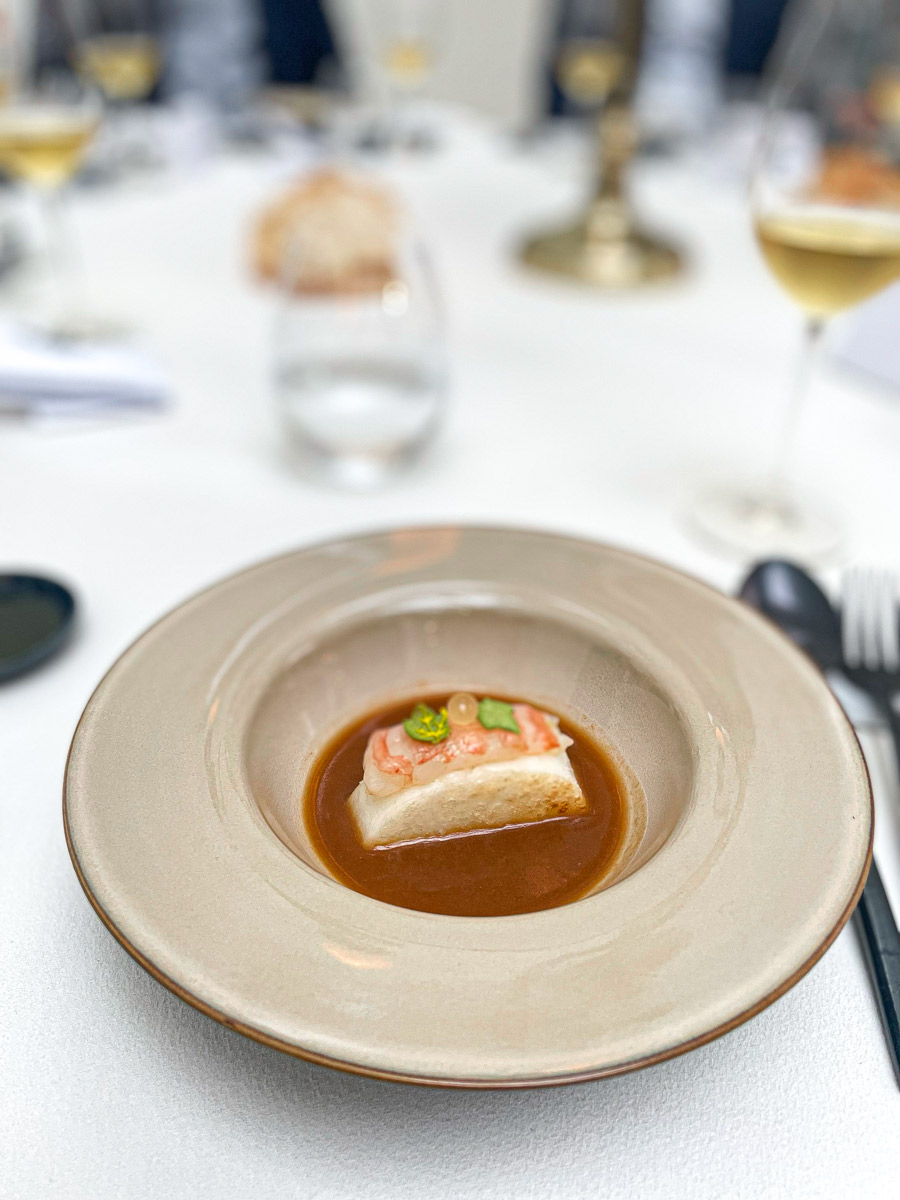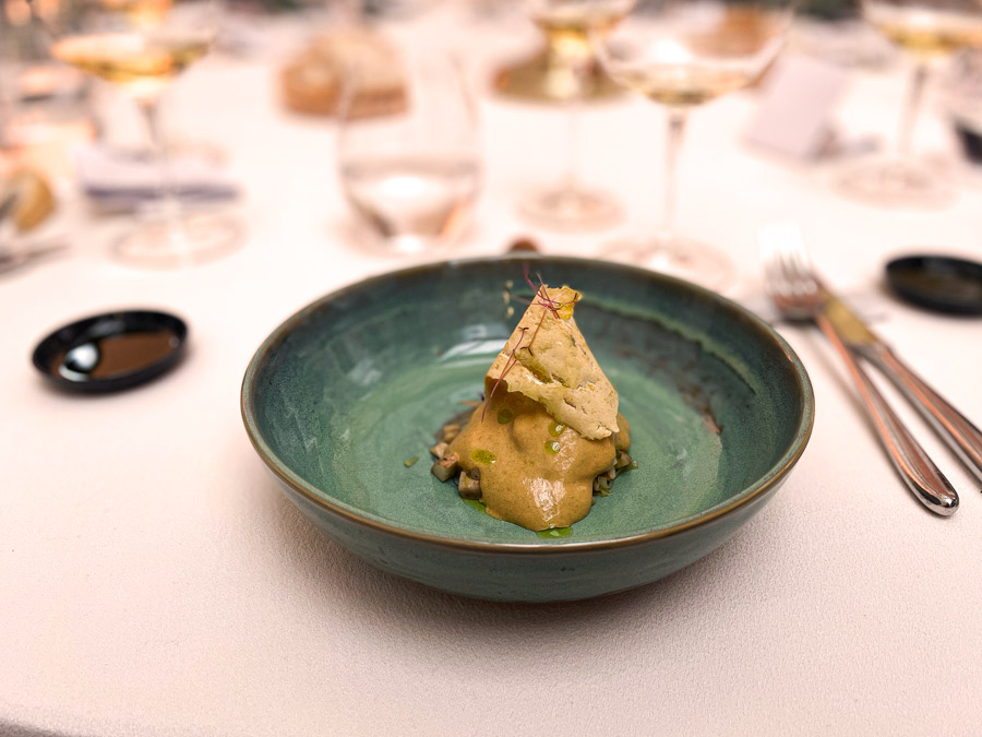 Formalni dio gala ručka otvorili su Pergola i Draga di Lovrana dubokim, moćnim bisqueom od škampa, s nježnim repom škampa na bijeloj palenti . Slijedili su Navis i Badi s jakovskim kapicama i porilukom, hollandaiseom od školjki i izvrsnim aromatičnim vrganjima. Foša se predstavila čvrstom, snježnobijelom grdobinom s kompleksnim slatkim curryjem od gambera rossa. Nama se ipak najviše svidio tanjur kojeg su pripremili Pelegrini i Korak. Dimljeni pivac u kelju Rudija Štefana i trgani kozlić Bernarda Koraka oduševili su autoritetom visoke gastronomije. Desert Dubravkinog puta od bijele čokolade i maraschina bio je lagan, prozračan i graciozan.