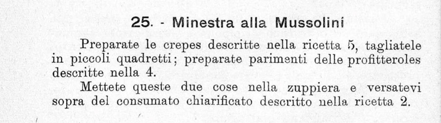 Cesare Tirabasso je 1927. objavio Vodič za kuhanje u koji je uključio nekoliko posveta Mussoliniju, poput Minestre littorio ili Minestre alla Mussolini. Riječ je samo o drugačije nazvanim masovno poznatim jelima. Jedna je consomme s komadićima palačinki, a druga je juha zgusnuta pireom od pilećih prsa.