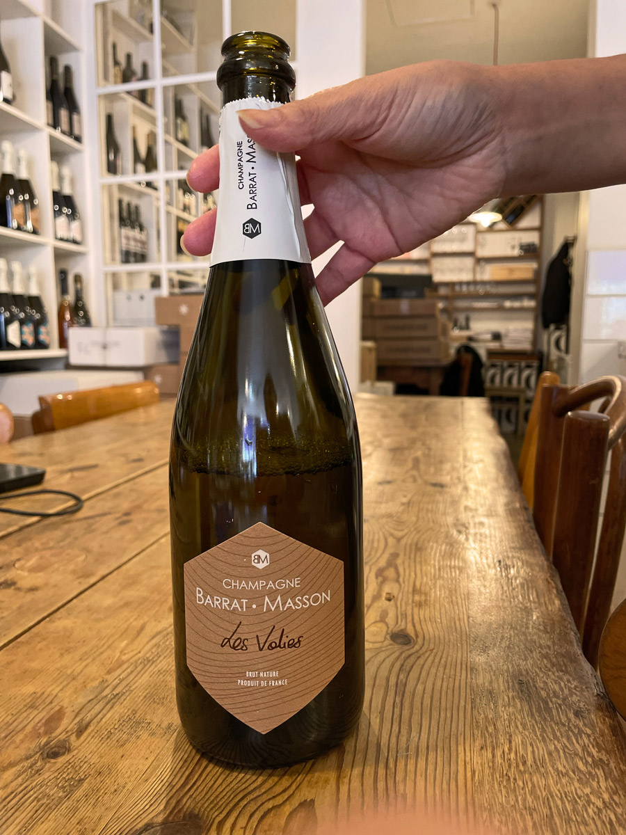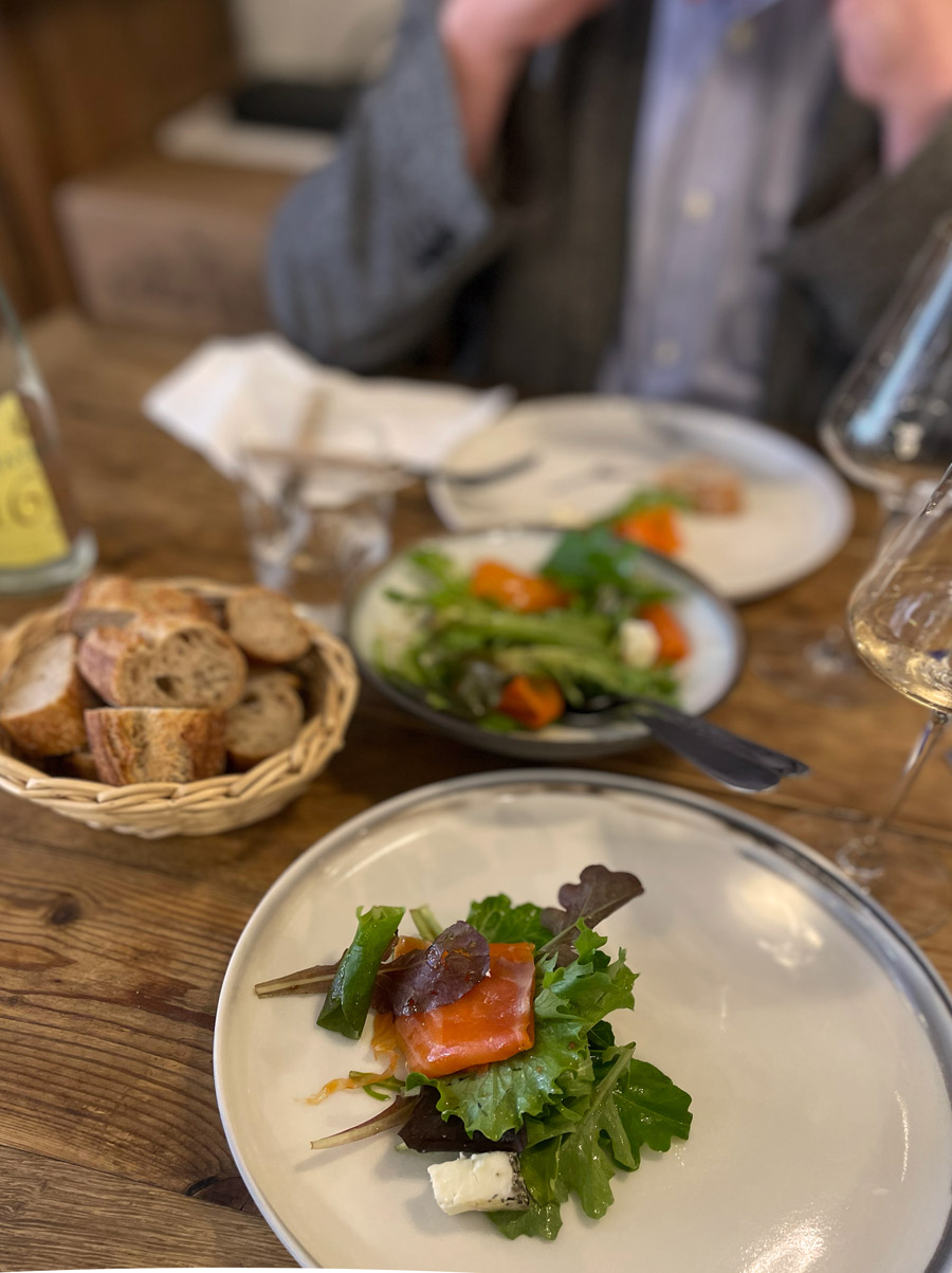 Au Bon Manger lokal je koji prodaje isključivo prirodne šampanjce i prirodna vina. Prvu rundu vina ne možete naručiti po vašem izboru, nego morate probati naslijepo. Nama su donijeli Val Champignat Extra Brute Etienne Sandrin, s brutalno visokom jabučnom kiselinom i preslabim perlanjem. Zatim smo prešli na neusporedivo bolji Barrat-Masson uz koji smo pojeli salatu s izvrsnom dimljenom pastrvom fini, slatkasti pršut s Pirineja i par feta lokalnih sireva. Odlični brie još je jednom pokazao da sireve poput camemberta, brieja i roqueforta uglavnom nema smisla kupovati u supermarketima.