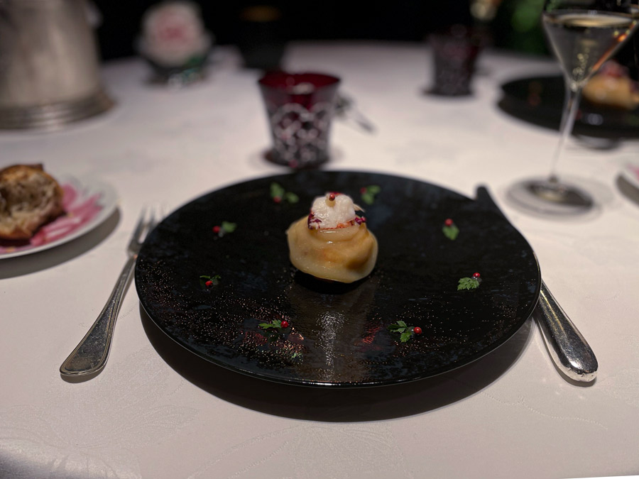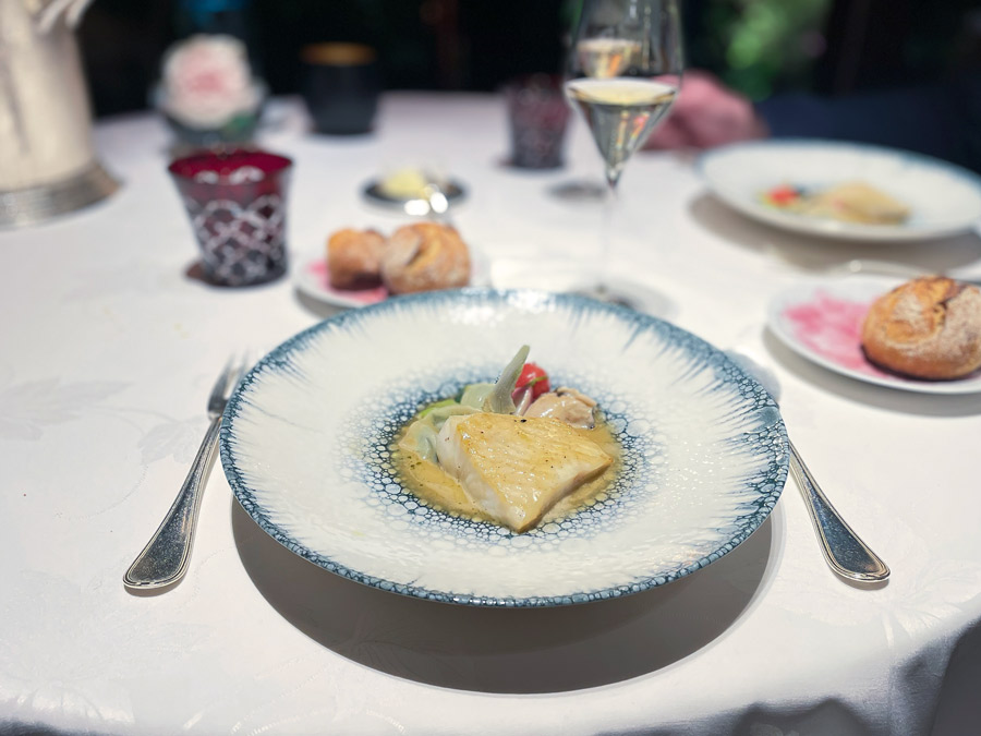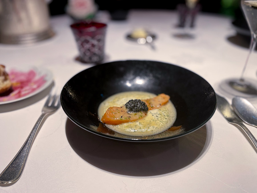 Nježno poširani losos bio je garniran rastrošnom količinom odličnog, ne preslanog kavijara, no pire od dimljenog krumpira s vrhnjem i pjenasti beurre blanc sa šampanjcem možda su ipak zagušili ribu i kavijar. Debeli file šanpjera serviran s Gillardeau kamenicom bio je blago prepečen, no zato je jelenji steak bio uzorno crven.