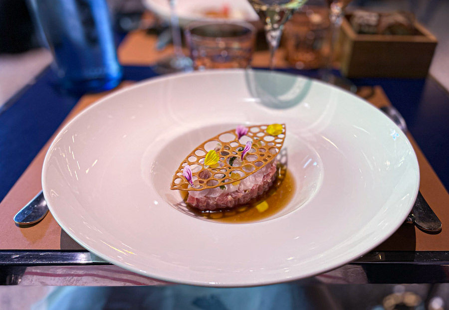 Ove duhovite intervencije čine konvencionalnu hranu drukčijom i zabavnom, a ne ugrožavaju njen integritet i bazične okuse. Filei pollocka (pollock se na hrvatski katkad prevodi kao crni bakalar, što je pogrešno) režu se od ribe ubijene metodom ikejime, pa se serviraju s cvijetom tikvica i sokom od školjki.
