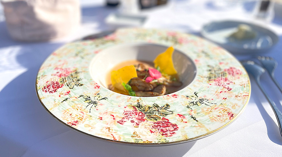 Petosljedni meni otvara se neodoljivim pozdravima iz kuhinje, hrskavim sipicama na aioliju i odličnom domaćim foccaciom s ružmarinom i bosiljkom. Carpaccio od kozica s narom, citrusima, pistacijama i kremom od kozica jedno je od najuspjelijih jela s kozicama na Jadranu unatrag dugo vremena.