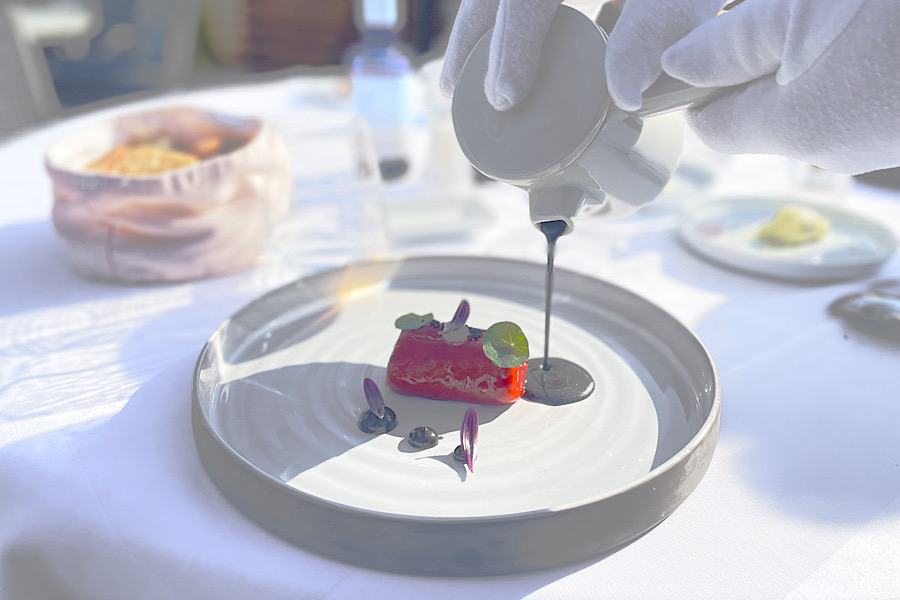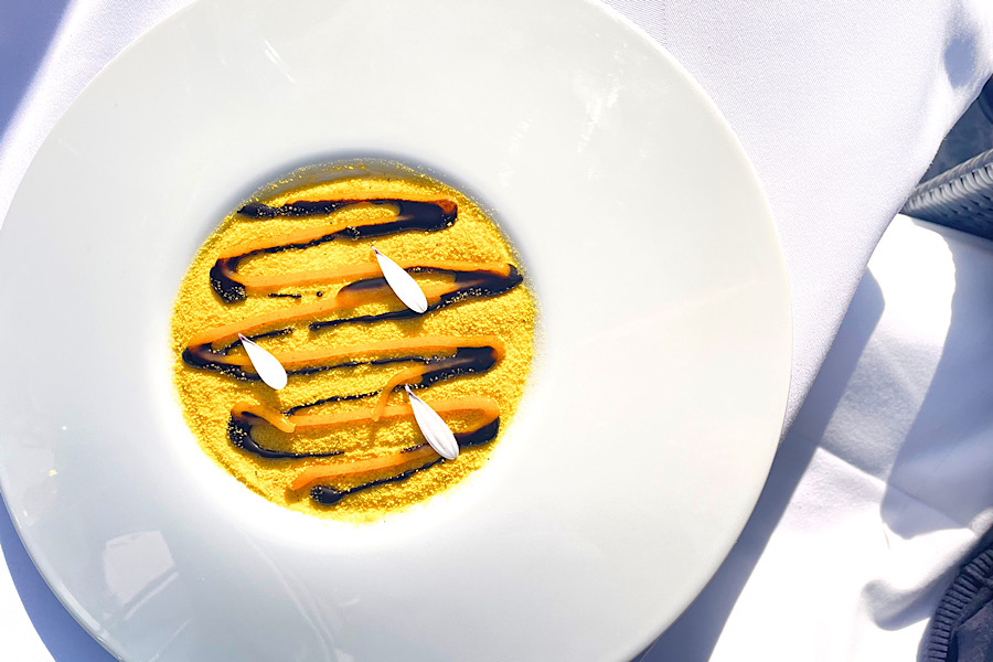 Petosljedni meni otvara se neodoljivim pozdravima iz kuhinje, hrskavim sipicama na aioliju i odličnom domaćim foccaciom s ružmarinom i bosiljkom. Carpaccio od kozica s narom, citrusima, pistacijama i kremom od kozica jedno je od najuspjelijih jela s kozicama na Jadranu unatrag dugo vremena.