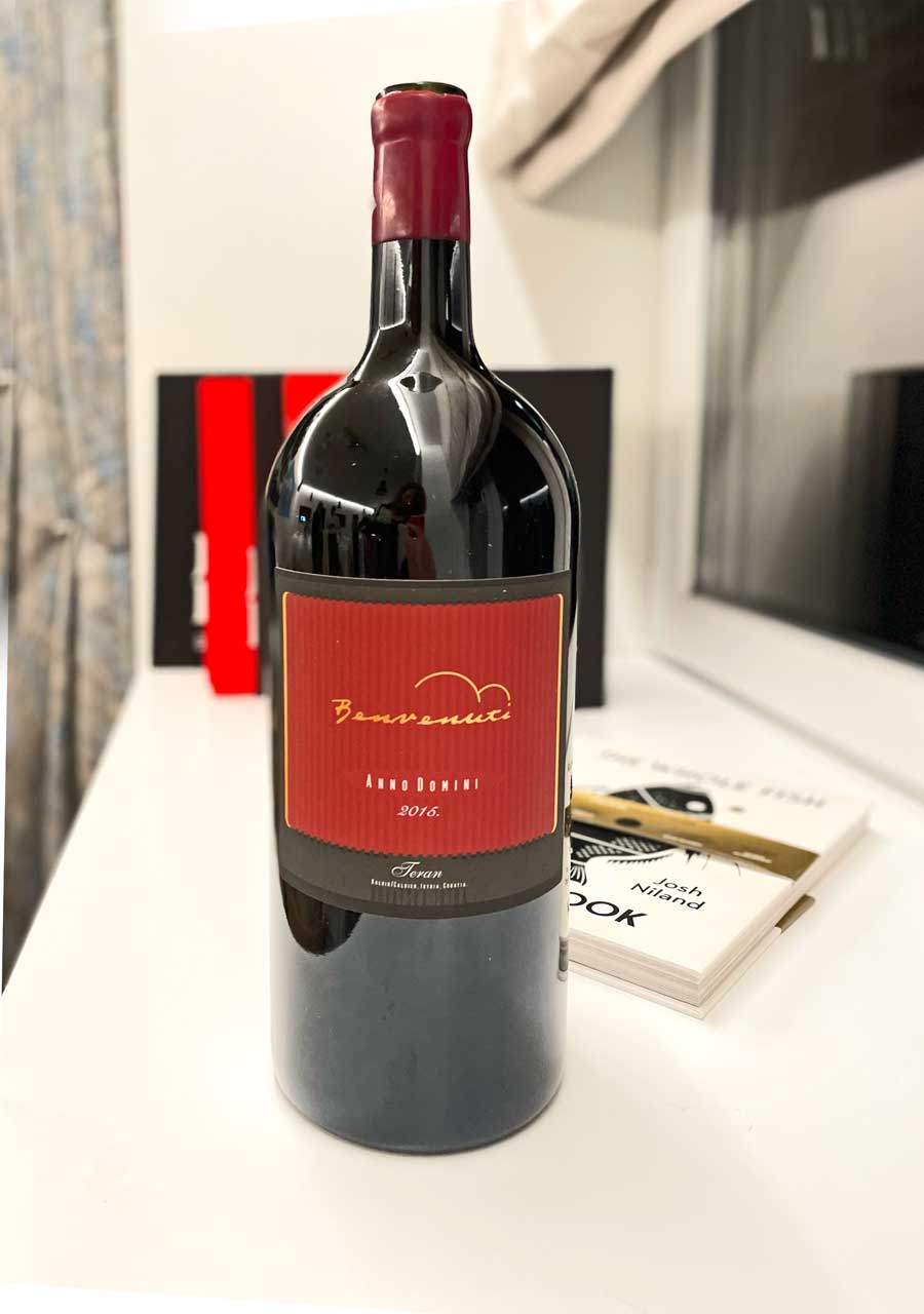 Nikola Benvenuti, bivši predsjednik Vinistre, Pojodinim je gostima predstavio portfolio jedne od najuspješnijih istarskih vinskih kuća: točili su se Rose (od terana i merlota) Malvazija iz lanjske berbe, ali i odležana vina poput spektakularnog Terana iz 2015. u jeroboamu (boca od tri litre). Ne znamo baš puno mjesta gdje se ovo izvrsno vino toči iz tako velike boce.