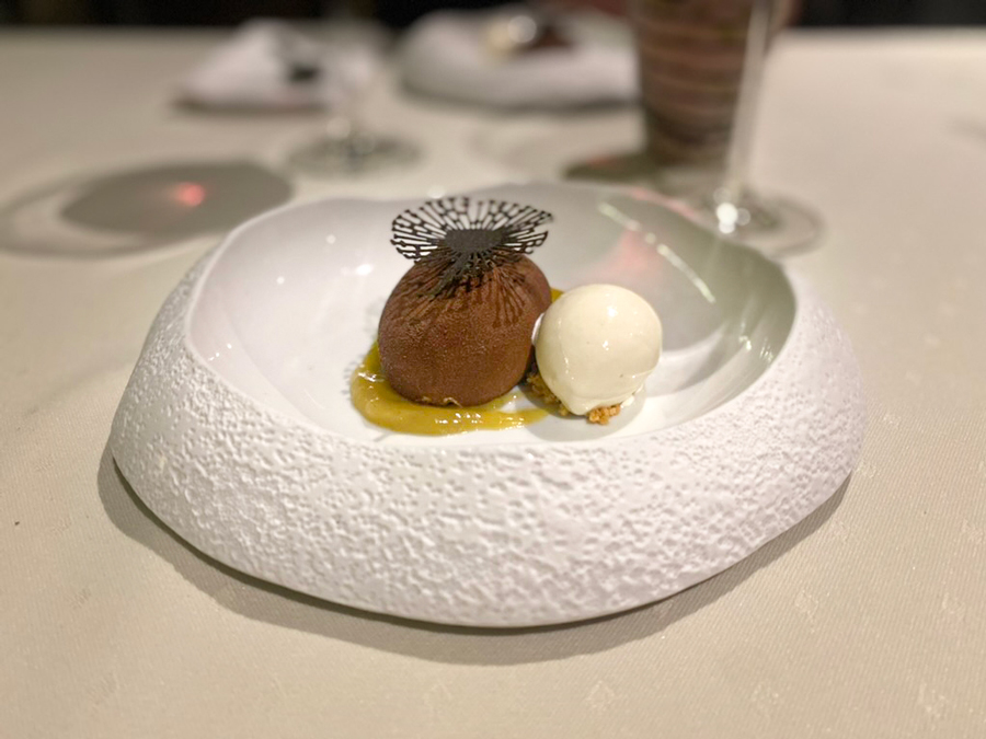 Kao glavno jelo poslužili su nam svinjske obraze s pire krumpirom. Svinjski obrazi su tehnički perfektno pripremljeni, sočni i mekani bez ijedne žilice, sa slatkastim jusom koji im da je kick. Pire je školski primjer kako bi pire trebao izgledati. Preddesert i glavni desert okusima nude i više od očekivanog i prate visoke standarde ostalih tanjura. Konobarica nam je rekla da palate cleanser poslužuju u šalicama starim 110 godina. Glavni desert je čisti sezonski, od kestena, klasičan i vrlo ukusan.