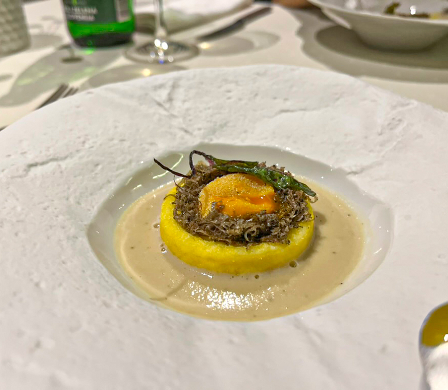 Pašta, kuhana precizno al dente, umak kremast i sočan bez kapi vrhnja. Inače, ova je pašta uvijek na Mahorčičevom jelovniku, mijenja se ovisno o sezonskim namirnicama. Nakon pašte dobili smo jelo koje se nikad ne mijenja, koliko smo shvatili riječ je o njihovu potpisnom jelu. Nabujak od Zidaričevog sira, žumanjak, svježi tartufi kad su u sezoni i lagani delikatni umak od ljutike. Definitivno najbolje jelo večeri, zbog kojega se samoga isplati doći kod Mahorčiča, jedno od najboljih koja smo probali ove godine.