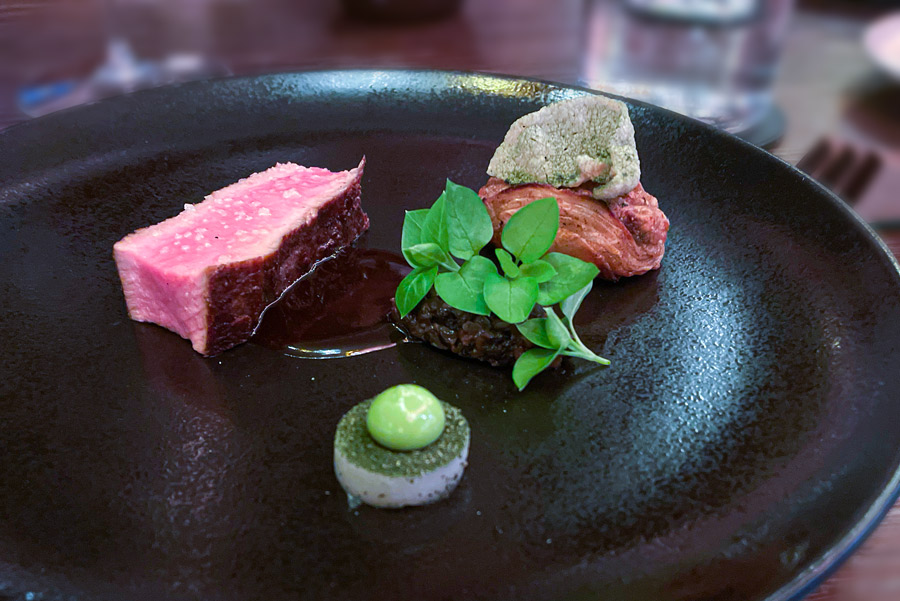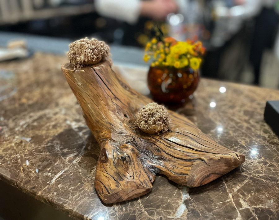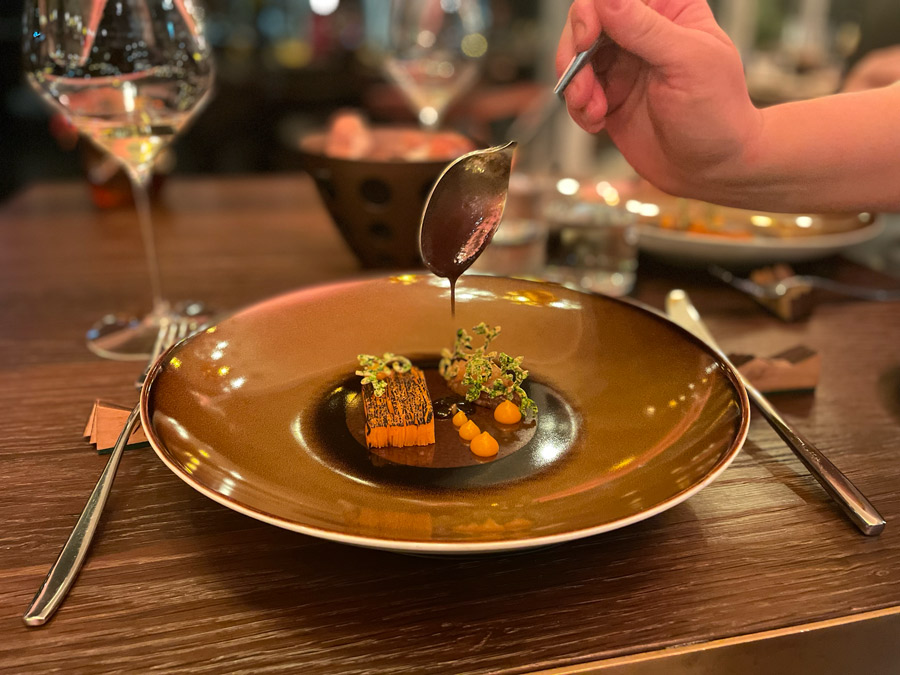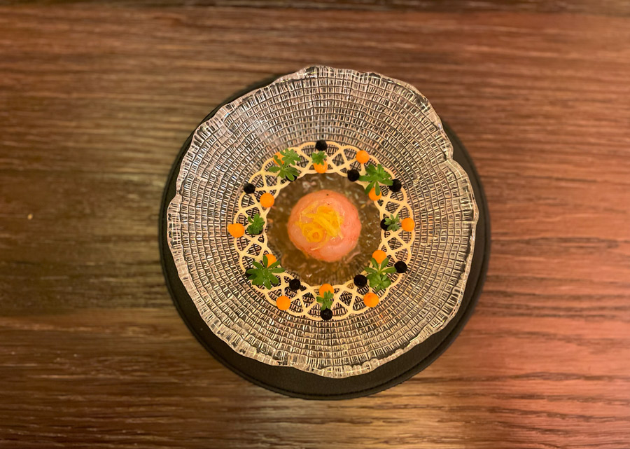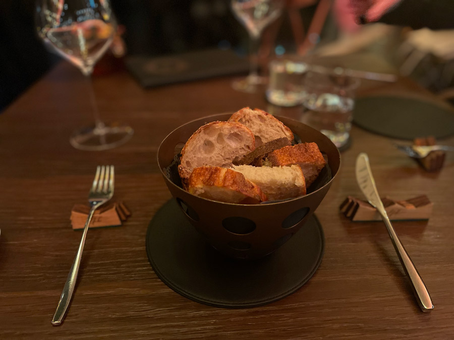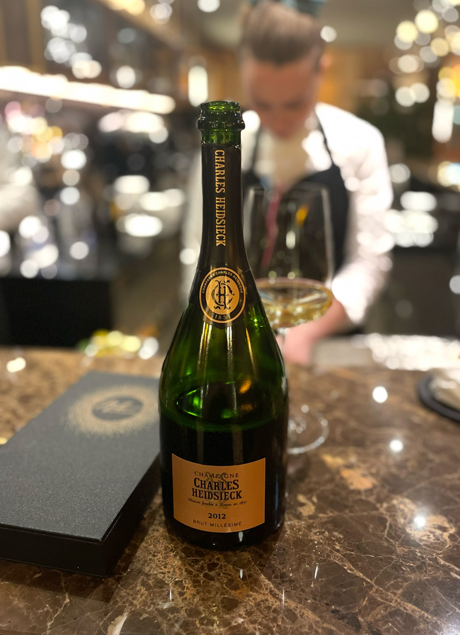 Početak večere u Nebu zanimljiviji je od kompletne večere u mnogim drugim restoranima u Hrvatskoj. Prvo sjednete za bar gdje vam natoče genijalan šampanjac Charles Heidsieck iz fantastične berbe 2012. Uz šampanjac dobijete tri mala jela karakteristična za hrvatske regionalne kuhinje: okruglica “fritaje” uvaljane u puno svježe ribanih crnih tartufa bila je senzacionalna. Četvrti snack stiže kad sjednete za stol. Ovaj put su to bile kockice koje simboliziraju puricu s mlincima.
