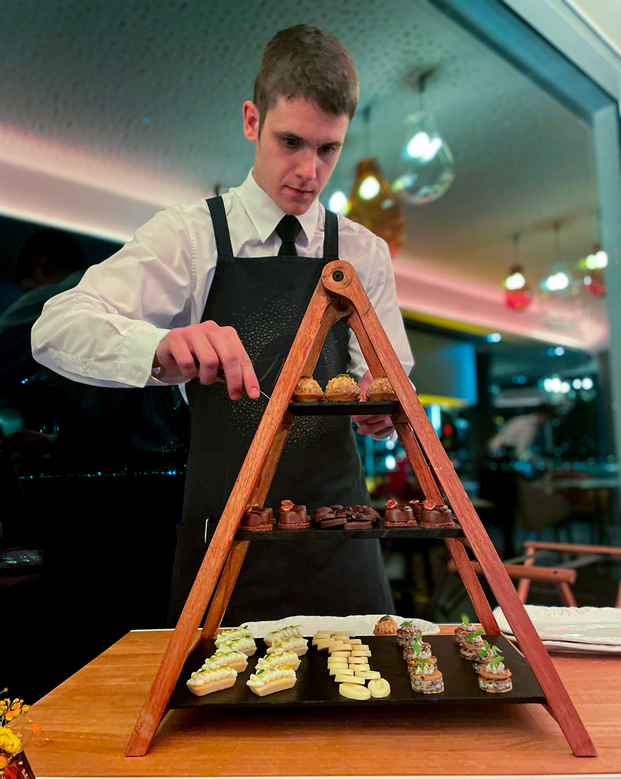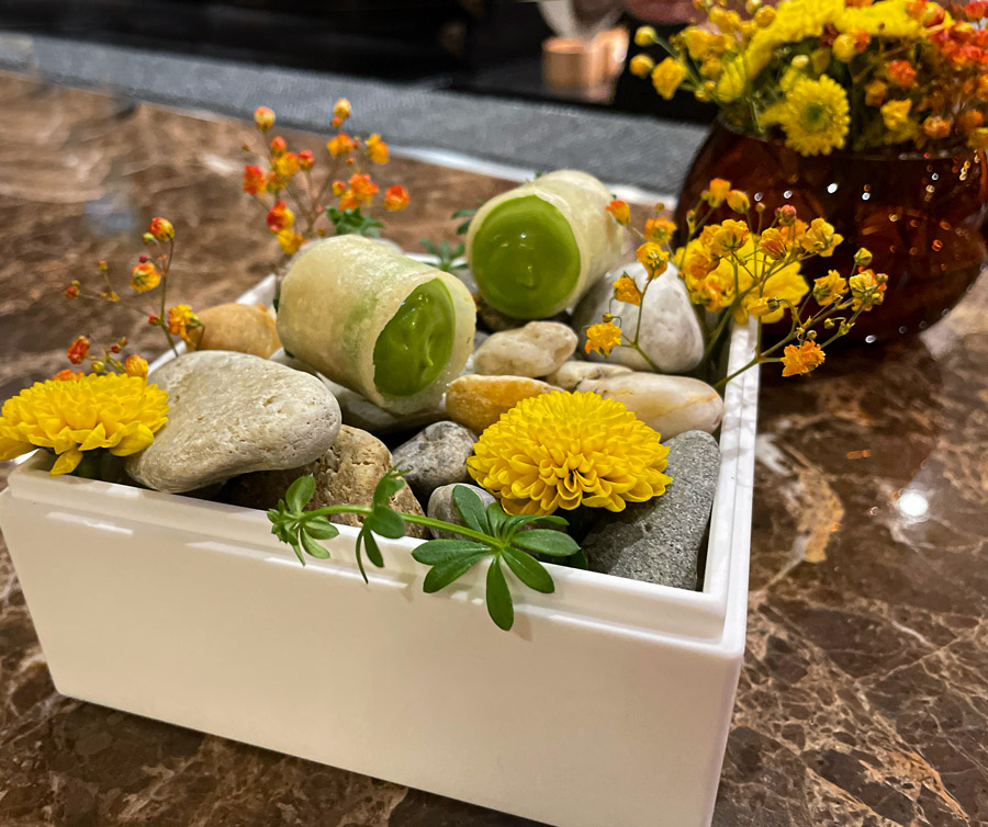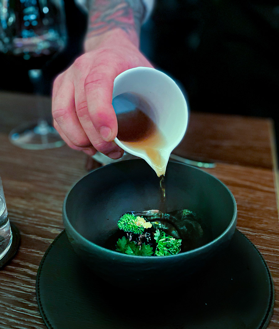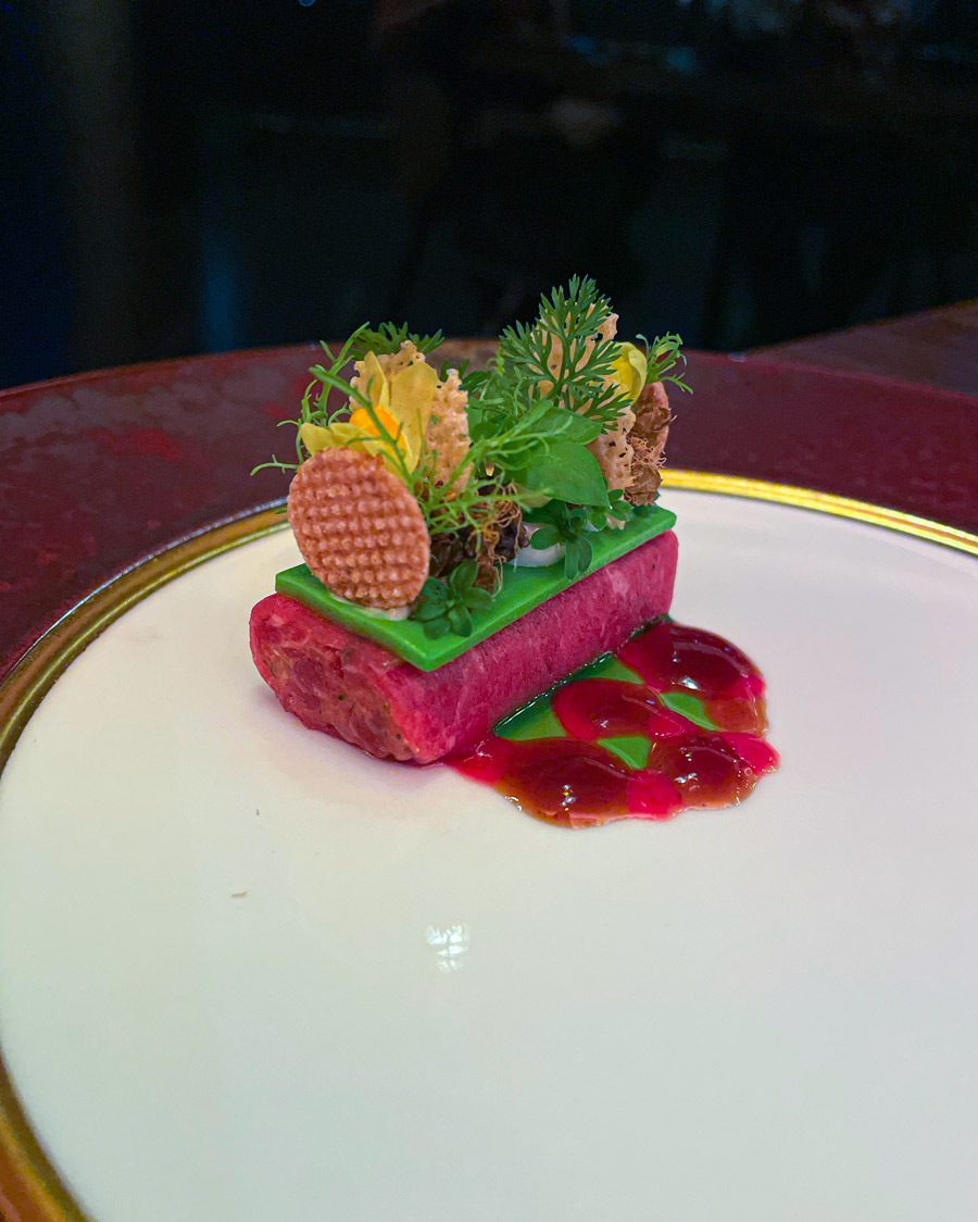 Početak večere u Nebu zanimljiviji je od kompletne večere u mnogim drugim restoranima u Hrvatskoj. Prvo sjednete za bar gdje vam natoče genijalan šampanjac Charles Heidsieck iz fantastične berbe 2012. Uz šampanjac dobijete tri mala jela karakteristična za hrvatske regionalne kuhinje: okruglica “fritaje” uvaljane u puno svježe ribanih crnih tartufa bila je senzacionalna. Četvrti snack stiže kad sjednete za stol. Ovaj put su to bile kockice koje simboliziraju puricu s mlincima.
