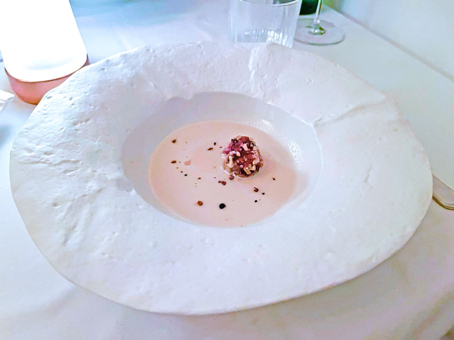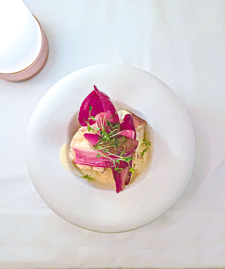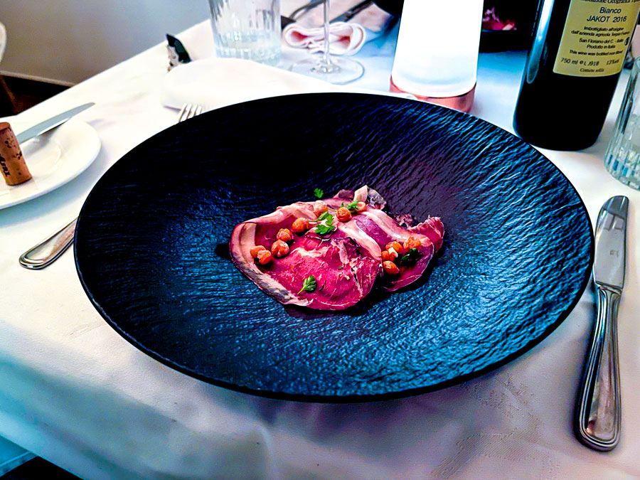U restoranu nudi kraći jelovnik od tri slijeda i duži od šest slijedova. Izabrali smo duži. Večera je započela na neobično starinski način, kruh umočen u sir i mlijeko s čvarcima i odličnim crvenim radičem, jelom o kojem smo puno slušali od starijih generacija. Slijedila je hipnotizirajuće mirisna kućna bresaola koju od proljeća tretiraju kremom od vrganja i slanutkom. Ovom lijepom i ukusnom tanjuru nedostajao je kruh ili brioš da bi bio fantastičan. Slanutak je tek donekle nadomjestio prijeko potrebnu hrskavu komponentu.