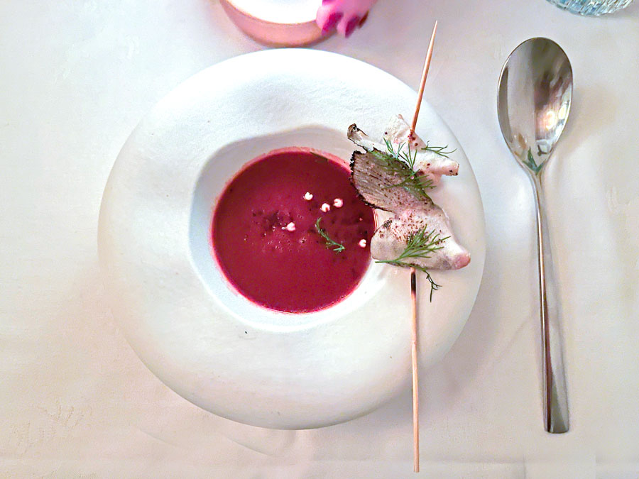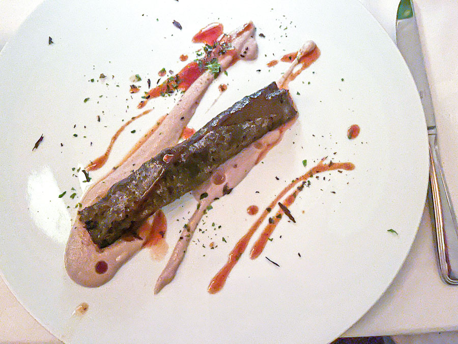Glavno jelo pokazuje hrabrost u eksperimentiranju s tradicijom i vrlo je atraktivno, iako ima mana. Sočno meso jelena umotano je u alge s kremom slanutka i jelenovog jusa. Alge su nažalost ugušile inače odlično jelenovo meso. Međutim, kad smo maknuli omotač od algi, dobili smo poptuno drukčije i zapravo bolje jelo. Svejedno, cijenimo iskreni pokušaj u stvaranju jela. Desert je također kreativan i nimalo ne podilazi širokom ukusu: marcipan u obliku hladne juhe s votkom i okruglicom različitih vrsta voća i orašastih plodova. Desert je višedimenzionalan, prvo se osjeti marcipan, zatim udara votka koja bogato oplemenjuje desert.