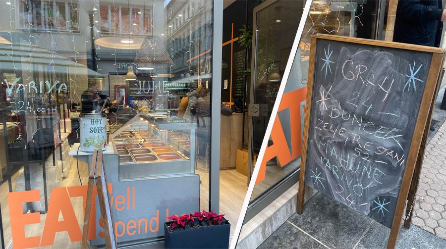 Što znači trošite manje? Sarma u Eat Well košta 34 kune, grah s kobasicama 24 kune, bruschetta 12 kuna, a najskuplje jelo koje smo vidjeli, buncek s kiselim zeljem, oko 50 kuna. Jeftinije definitivno ne može. I ovo je sumnjivo prejeftino. Pod uvjetom da je ta hrana barem srednje jestiva, Eat bi mogao postati prilično uspješan. Eat nema stolove, nego samo šest ili sedam šank stolica, a hrana se, naravno, naručuje i dostavlja za van. Eat Well vjerojatno je najjeftiniji lokal s hranom, ne računajući sendvič barove, u strogom centru Zagreba.