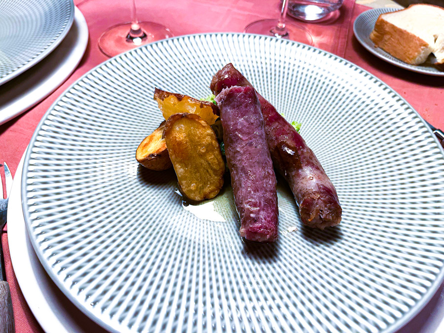 Glavno jelo, istarska kobasica s polama krumpira i kelj, već je iskupila grijehe rižota. Priprema je zanimljiva. Vlasnik dolazi pred kamin s kobasicama u škartocu i plehu i uzima žar kako bi pokrio cijeli pleh pa ostavi sve da se peče četrdesetak minuta. Rezultat su sočne i vrhunske kobasice dostojne najboljih konoba u Istri. Krumpir ne zaostaje za glavnim jelom, također je odličan. Hrskav izvana, mekan iznutra, nemastan i dovoljno slan kako ne bi bio bezokusan.