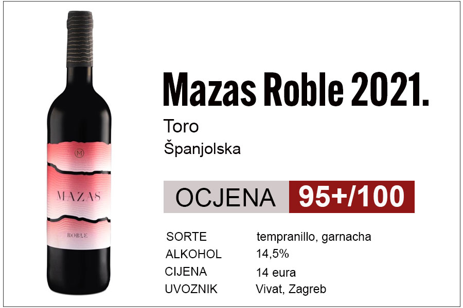 Riječ roble, koja doslovno znači hrast, u Španjolskoj označava mlađa vina, koja su kraće vrijeme provela u hrastovim bačvama. Novi Mazas Roble, iz 2021. godine, po mnogočemu se razlikuje od platinastog prethodnika, ali ne u lošem smislu. Šampionski Mazas Roble bio je intenzivna voćna bomba, s nevjerojatnom koncentracijom crnog i crvenog voća, uokvirenog u ponešto dima i čokolade.