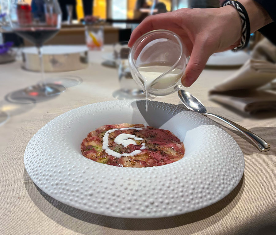 Zatim vas osoblje dovodi do stola i predaje jelovnike. Filozofija i cilj novog jelovnika u Agli Amici je korištenje svih djelova namirnice, pa nije rijetkost da jedno jelo naraste i na tri ili četiri tanjura ili elementa. Agli Amici trenutno nudi dva jelovnika, riblje/mesni i vegetarijanski, kao i opciju pojednačnih jela iz oba jelovnika, što je u restoranima poput ovoga operativno iznimno teško i pohvalno. Mi smo se odlučili za standardni riblji i mesni jelovnik, koji službeno ima šest slijedova, no s pozdravima i svim dodatnim zalogajima naraste i do petnaestak jela.