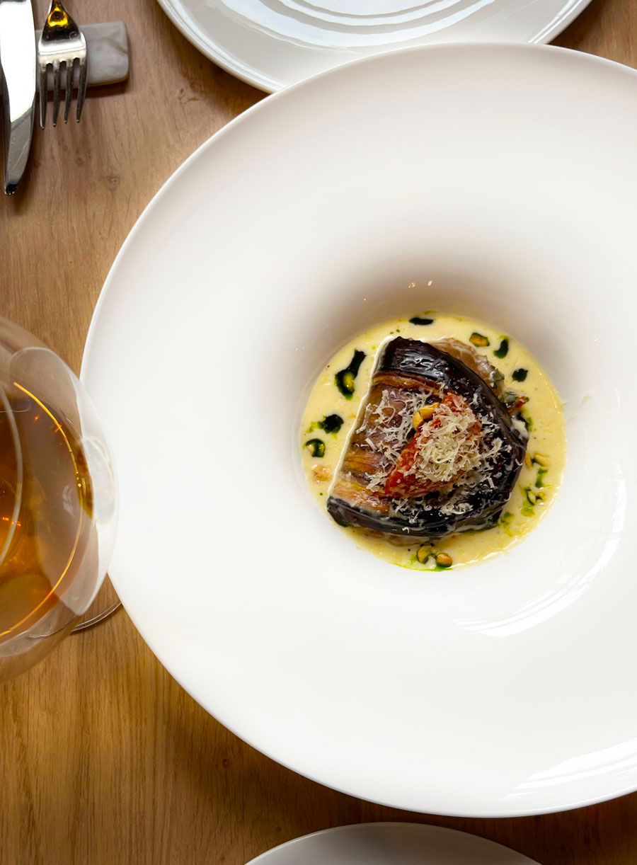 Ručak smo započeli s “lažnom parmigianom” koja se sastoji od nekoliko različitih tekstura patlidžana, neodoljivog umaka od tolminskog sira, maslaca od kikirikija, crnog češnjaka i paste od rajčica. I tu se odmah osjeti da će jela biti posebna. Parmigiana je lagana, a istodobno bogata okusima, svaki joj mali element pridodaje svoju specifičnost, bez koje to jelo jednostavno ne bi bilo isto. Uslijedila je “obična” salata s tržnice koju nam je osobno prezentirao chef Fonseca. Ana in Slon salata je zamotani list zelene salate u kojem se skrivaju jabuka, celer, dresing od majoneze i karamelizirani slanutak, a kao dodatak dolazi humus koji je pojačan s misom, sve zaokruženo fantastičnim kruhom iz Pekarne Ana. Čisti okusi, balansirani dodaci, jedna od uistinu najboljih salata koje smo jeli. Ikada.