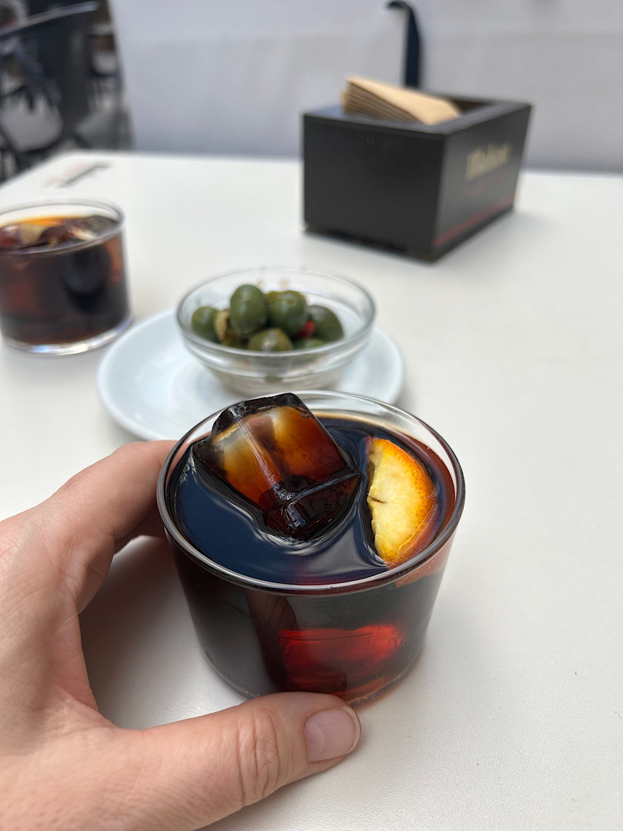 Radi se o vrlo dobrom, tamnom, polusuhom vermutu koji košta 3,80 eura za čašu. Uz vermut smo dobili i zdjelicu solidnih zelenih maslina. Dakle, dva dobra originalna pića u poznatom povijesnom kafiću na izvrsnoj lokaciji, platili smo 7,60 eura. Što je na donjoj granici zagrebačkih cijena i neusporedivo ispod cijena na Stradunu.