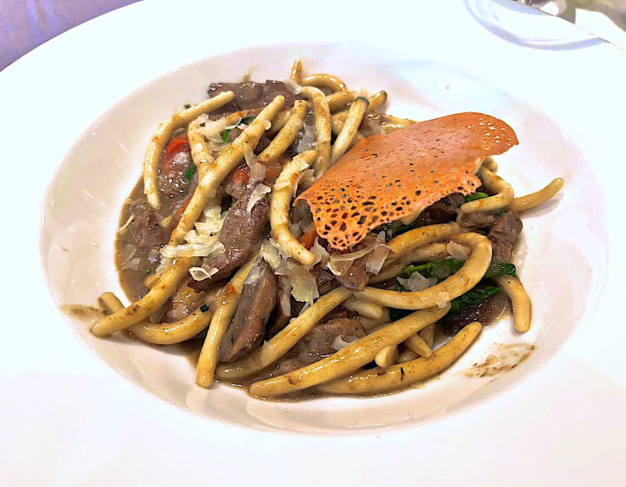 Pljukanci s biftekom pokazali su, pak, da Zlatna školjka nije samo riblji restoran. Pljukanci su bilo neočekivano dobri. Meni, zasad, pokazuje samo dvije slabe točke. Prvo, puno rižota govori o tome da se rižoto ne kuha kao rižoto. Drugo, deserti su pomalo neinspirativni (ali su fritule bile odlične). Vinska karta sasvim je dobra s par izvrsnih vina, poput grka Križ i Krauthakerova Crnog pinota.