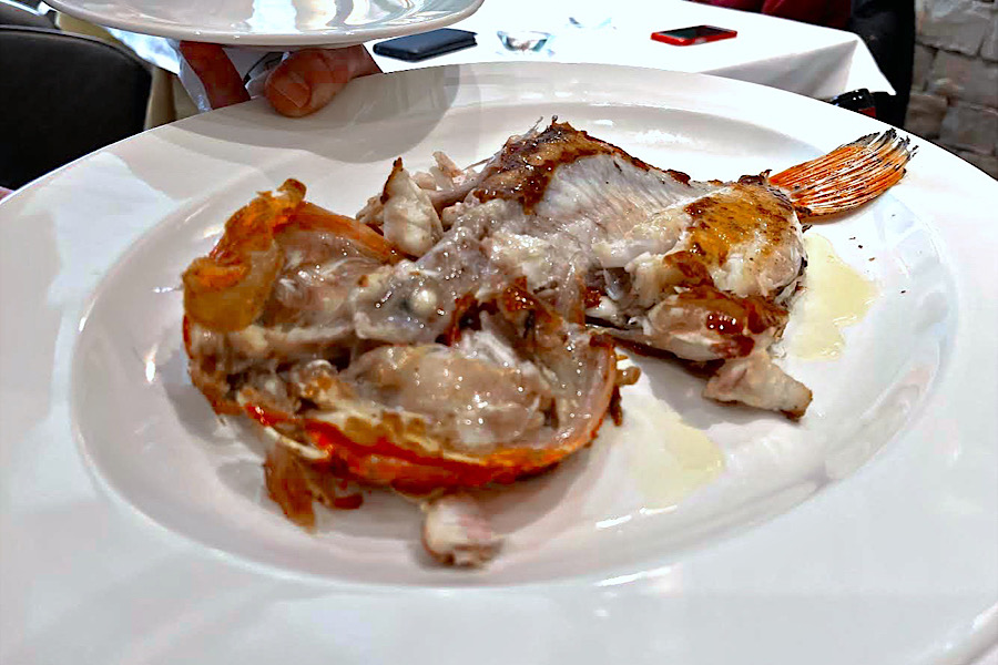 Ražnjiću nije trebala cherry rajčica, jer su u ovo doba godine rajčice bezokusne i zaista ih ne treba koristiti. Slijedila je fenomenalna škrpina na roštilju, paperjasta, a opet čvrsta s vrlo intenzivnim ribljim okusom. Zagrebu nedostaju restorani s plemenitom jadranskom bijelom ribom, pa bi Zlatna školjka mogla popuniti tu rupu na tržištu. Uz škrpinu smo dobili finu blitvu s krumpirom, srećom bez češnjaka. Kad već drži ovako dobru ribu, Zlatna školjka trebala bi držati i vrhunsko maslinovo ulje s potpisom. Rekli su nam da će ga uskoro nabaviti.