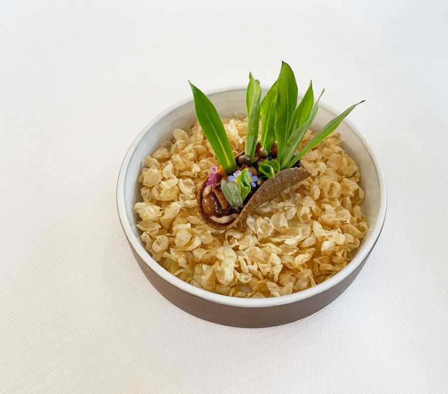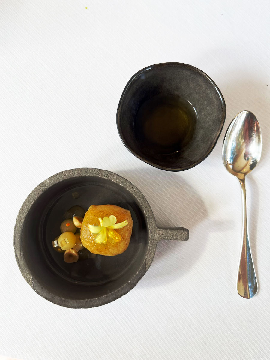 Uslijedio je red klasika, koji čine važan dio identiteta Hiše Franko. Beignet punjen sirom i ikrom pastrve apsolutno je fantastičan, dok nam je krumpir kuhan u sjenu ipak ostao nedorečen, spašava ga jedino duboki i kompleksni šumski consomme. Krumpir u sijenu nastao je, podsjetimo, kao simboličan odgovor chefice Roš na lanjsku najavu globalne nestašice žitarica.
