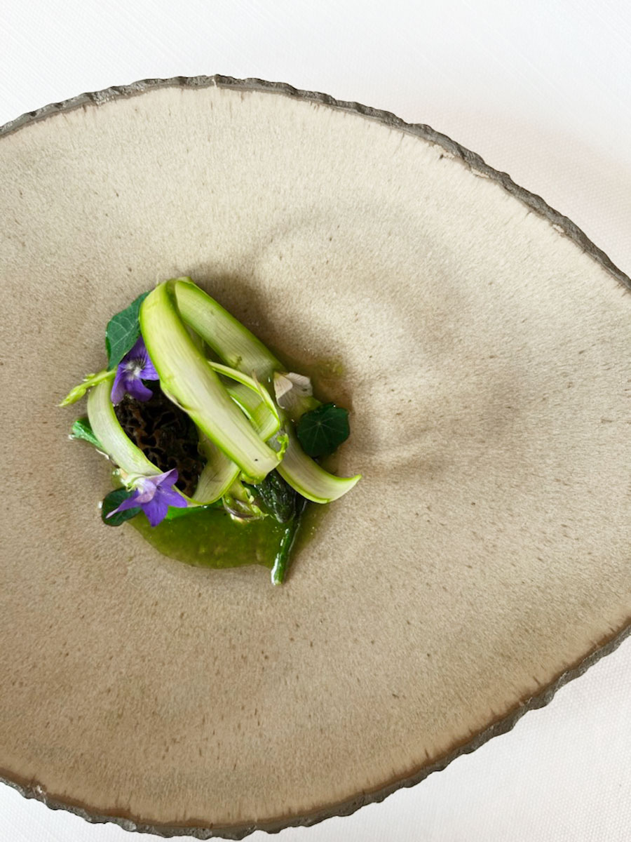 Početak ručka nježan je u okusima. Bijele šparoge perfektno upotpunjuje umak od dimljenog jaja i oraha, kao da se radi o nekoj višoj vrsti nevjerojatno ukusnog proljetnog doručka. Možda i najbolji uvod u ručak bio je treći zalogaj, dagnje u laktofermentiranoj vodi od rajčice. U ovoj kombinaciji dagnje su dobile posve novo značenje, s tek prisutnim ljutkastim aromama koje ostaju nekoliko minuta u aftertasteu.