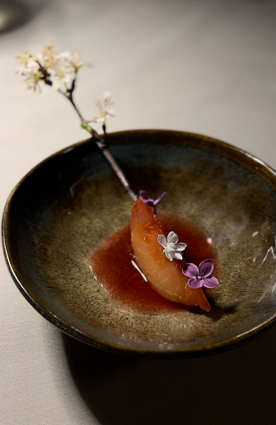 Pozdravi iz kuhinje znatno su elaboriraniji nego lani. Sashimi od kovača s hrskavom kovačevom kožom i mariniranom mladom mrkvom može, primjerice, funkcionirati kao efektno samostalno predjelo. A prvo predjelo bilo je doslovno briljantno. Chef Klarić divljim je šparogama pridružio Kumparičkin vrlo kremasti chevre, što je očekivano. No, siru je dodao čips od badema a šparogama sirup od kamilice, što je neočekivano; čips od badema i sirup od kamilice redefinirali su i divlje šparoge i kozji sir, jer su ublažili njihovu žestinu i učinili jelo elegantnim istodobno naglašavajući prirodne okuse.