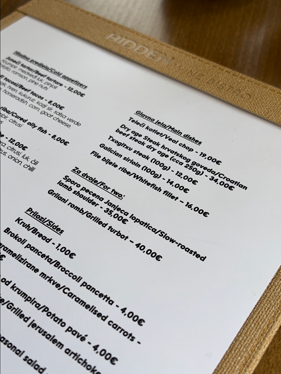 Jelovnik je gotovo savršen: sedam ili osam hladnih predjela popularnih formata poput cevichea, tartara i marinirane plave ribe. Zatim šest ili sedam toplih predjela od kojih je jedno privlačnije od drugog, poput dagnji u pivu i zapečenih njoki sa škampima. Tu je još i solidna kolekcija španjolskih i hrvatskih odležanih steakova plus romb za dvoje. Hiddenovi prilozi zabavniji su od glavnih jela u brojnim hrvatskim restoranima. Osobito grilane čičoke s pestom od medvjeđeg luka.