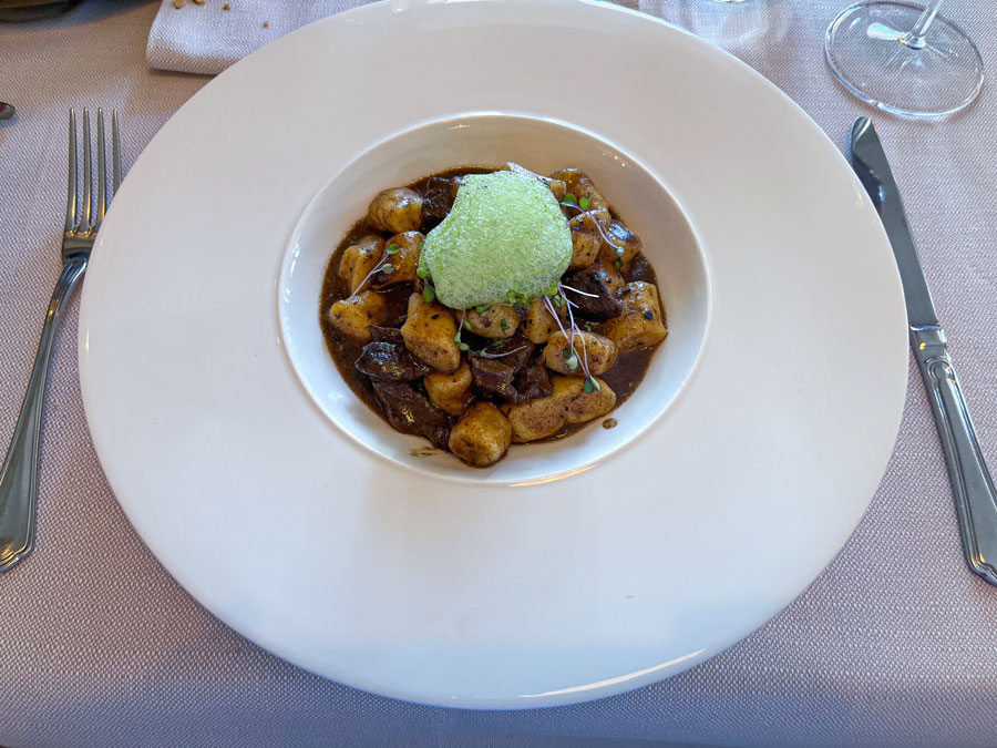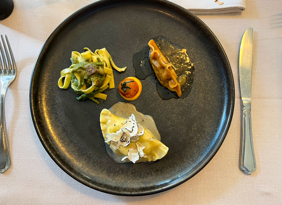 Tartar od govedine i carpaccio od boškarina vrlo su dobri, dok lardo nije dobro uklopljen u hladno predjelo. Za steakove, koji su nam zadnji put ostali u dobrom sjećanju, ovoga puta nismo imali snage, pa smo naručili nekoliko različitih pašta. Apsolutno najbolja bila je pašta s pijetlom koju toplo preporučujemo, tris raviola (šparoga, crni tartuf i gusja jetra) poseban svaki na svoj način, a njoki sa srnetinom odlični zbog bogatog, gustog, gotovo čokoladnog umaka. Ovdje se mora naglasiti kako je svaka pašta vrlo precizno kuhana.
